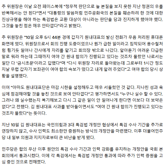그러니까 추 위원장도 급한 와중에 합의진행을 알고 있었다는 얘기잖어 그런데 마치 첨 듣는 소리라며 후려치던데 무슨 쇼임?