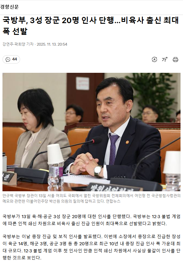 국방부, 3성 장군 20명 인사 단행… 비육사 출신 최대폭 선발