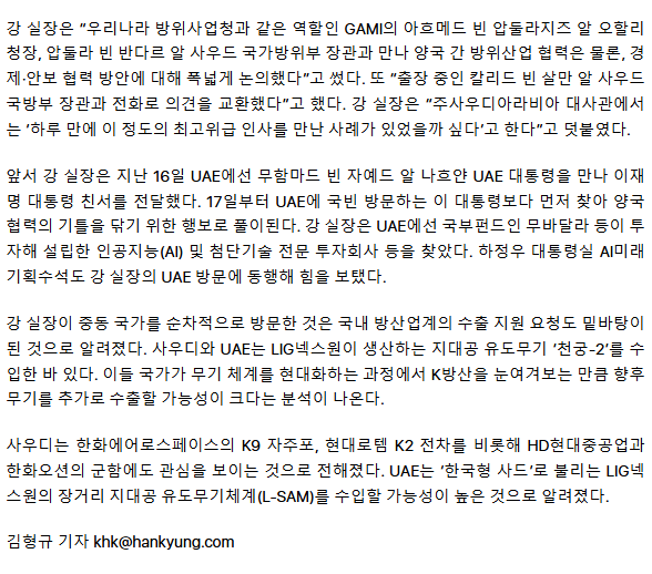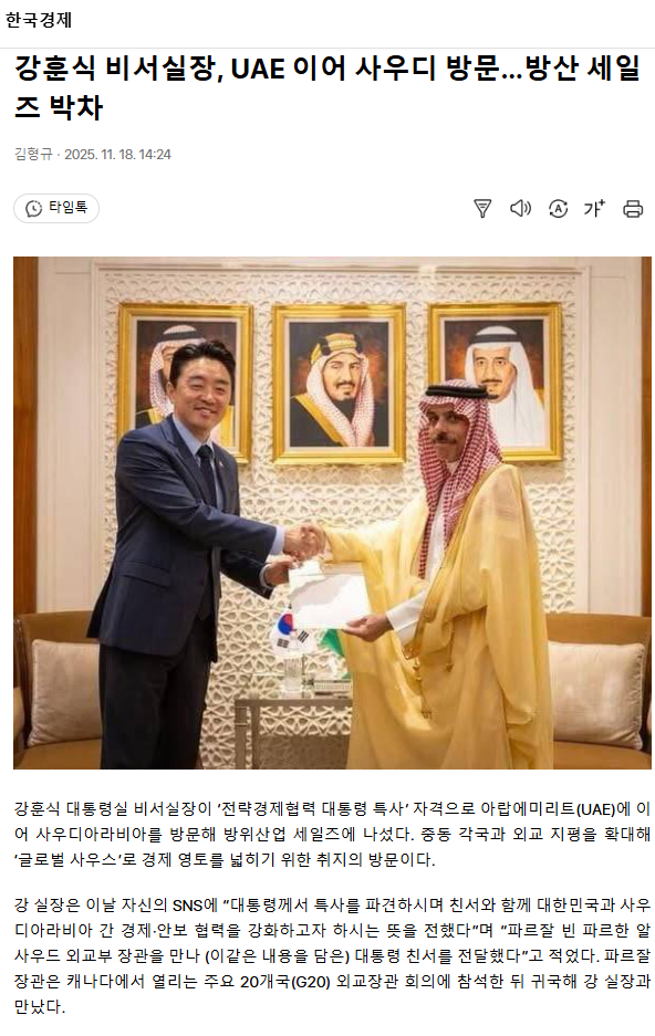 강훈식 비서실장, UAE 이어 사우디 방문… 방산 세일즈 박차