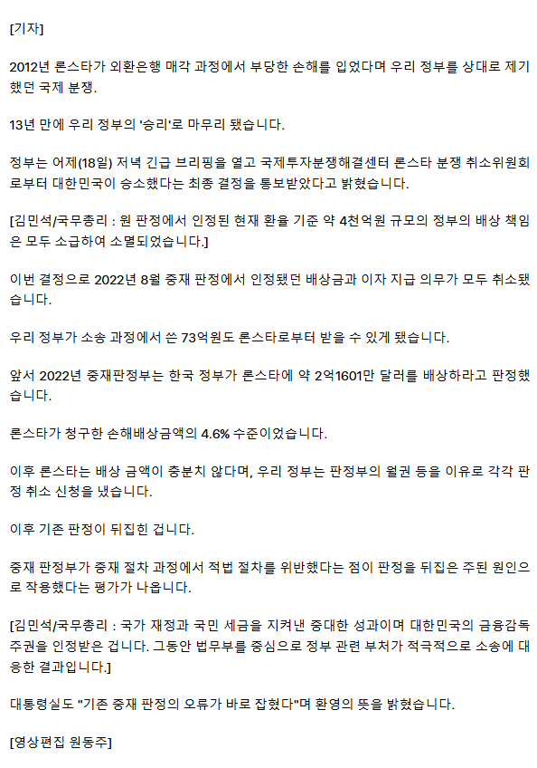 배상금 4천억에서 '0원'으로… 정부, '론스타 소송' 승소