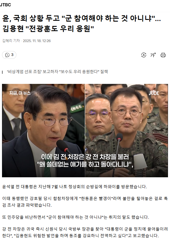 윤, 국회 상황 두고 "군 참여해야 하는 것 아니냐"... 김용현 "전광훈도 우리 응원"