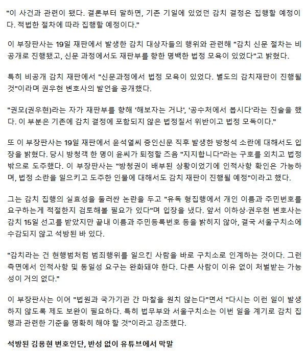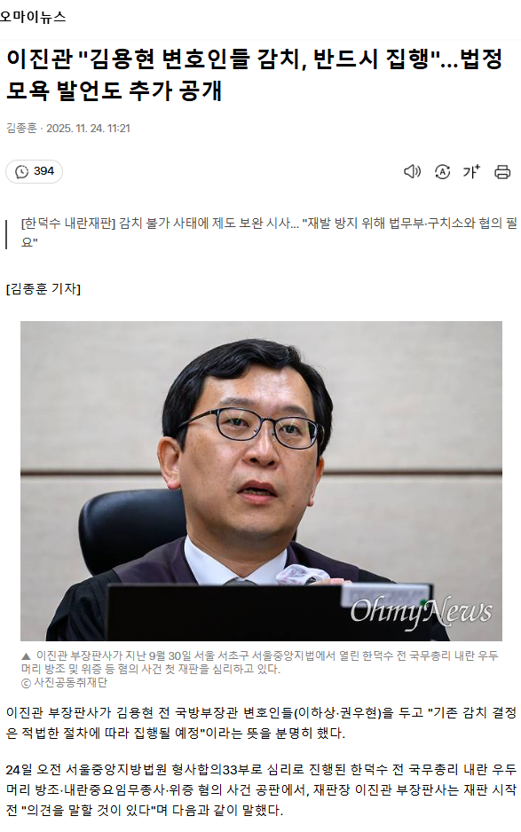 이진관 "김용현 변호인들 감치, 반드시 집행"... 법정 모욕 발언도 추가 공개 ㅡ 대법원은 침묵하네