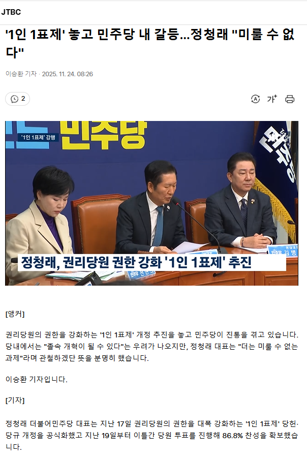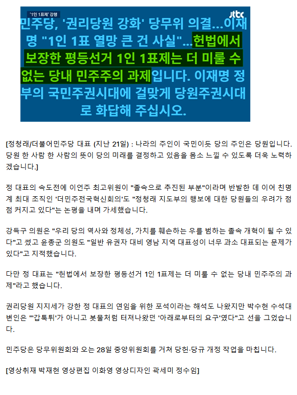 '1인 1표제' 놓고 민주당 내 갈등… 정청래 "미룰 수 없다"