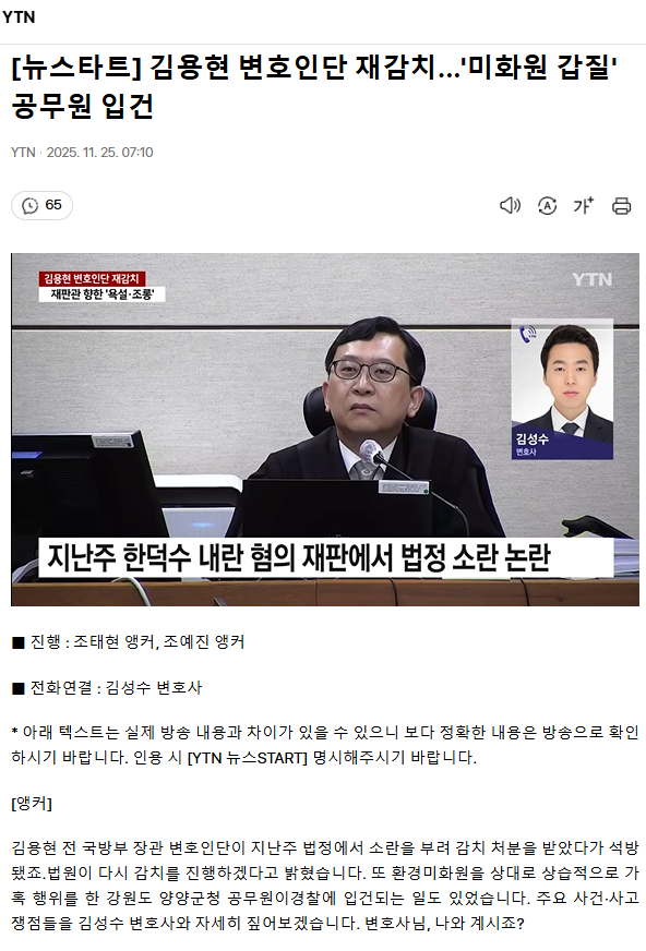 [뉴스타트] 김용현 변호인단 재감치... '미화원 갑질' 공무원 입건