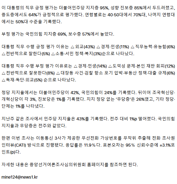 李대통령 지지율, 2주 연속 60%…민주 42% 국민의힘 24% [갤럽]