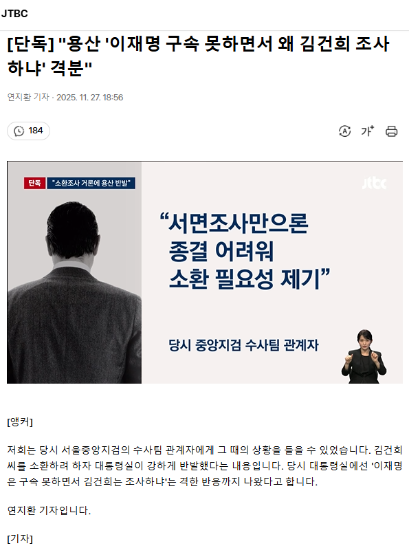 [단독] "용산 '이재명 구속 못하면서 왜 김건희 조사하냐' 격분"ㅡ 이재명은 죄 지은게 없네