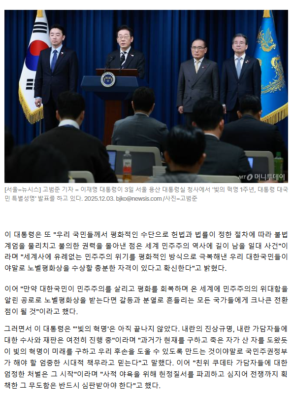 이재명 대통령 "12월3일 법정공휴일 정해야… 국민들 노벨평화상 자격"ㅡ 국민주권의날