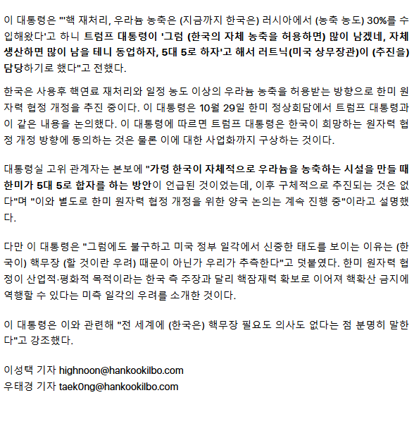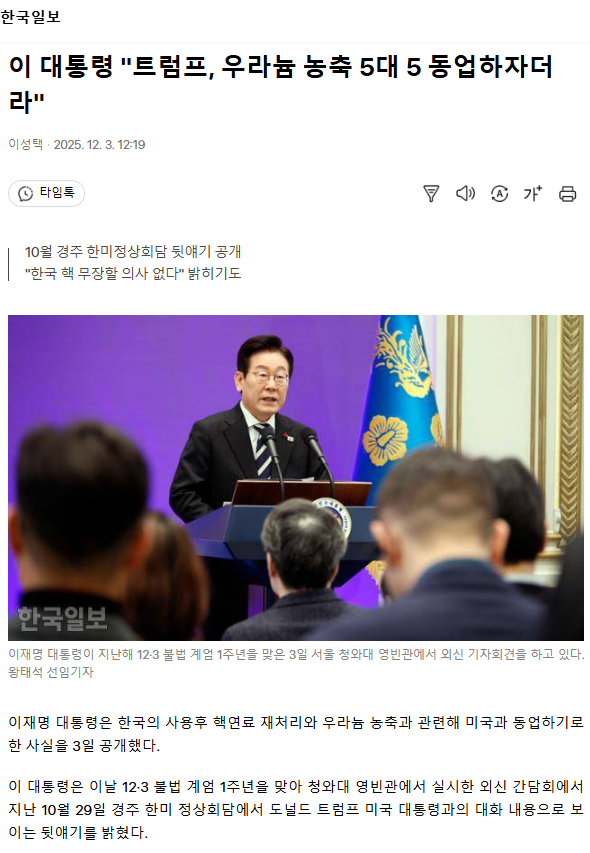 이 대통령 "트럼프, 우라늄 농축 5대 5 동업하자더라"
