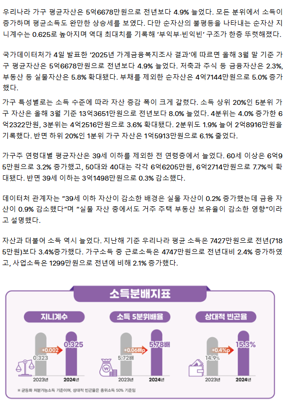 유독 한국만 자산이 부동산으로 70% 이상이 쏠려있는 비정상적인 구조인데다가, 근로 소득만으로 자산 증가 속도를 따라 잡을 수 없으니 갈수록 자산 빈부 격차가 나는건 당연한 것. 만악의 근원 부동산. 그러니 더욱 더 자본시장 구조 개선/개혁을 하고 대체 자산 형성 수단을 만드는 것이 더욱 더 중요 하겠네요. 분리과세 구간 신설도 아쉬운 점이 없지 않지만 그래도 아주 잘 하고 있습니다.
