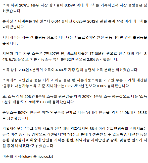 순자산 빈부격차 역대 최대‥ 소득 양극화도 심화