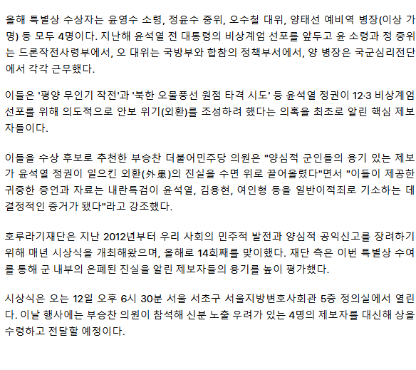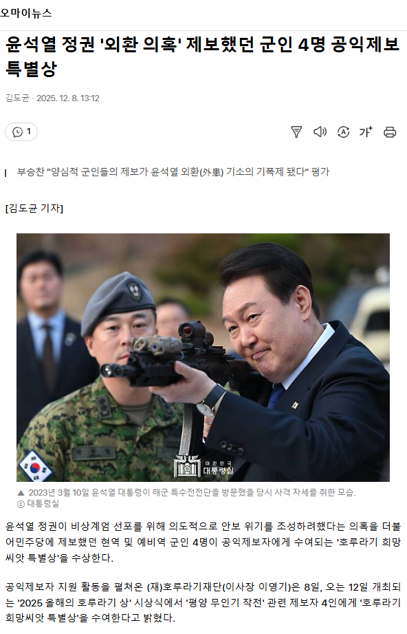 윤석열 정권 '외환 의혹' 제보했던 군인 4명 공익제보 특별상