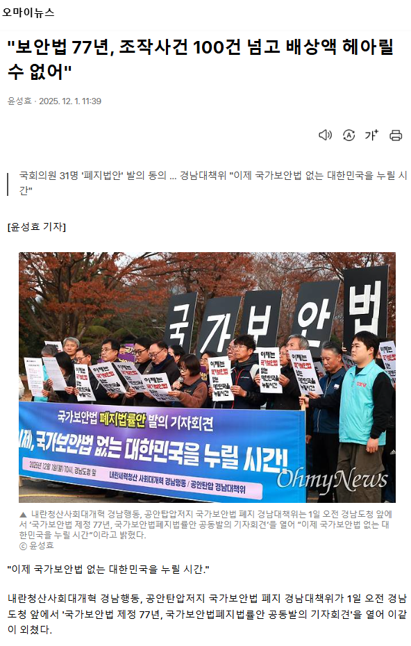 "보안법 77년, 조작사건 100건 넘고 배상액 헤아릴 수 없어"