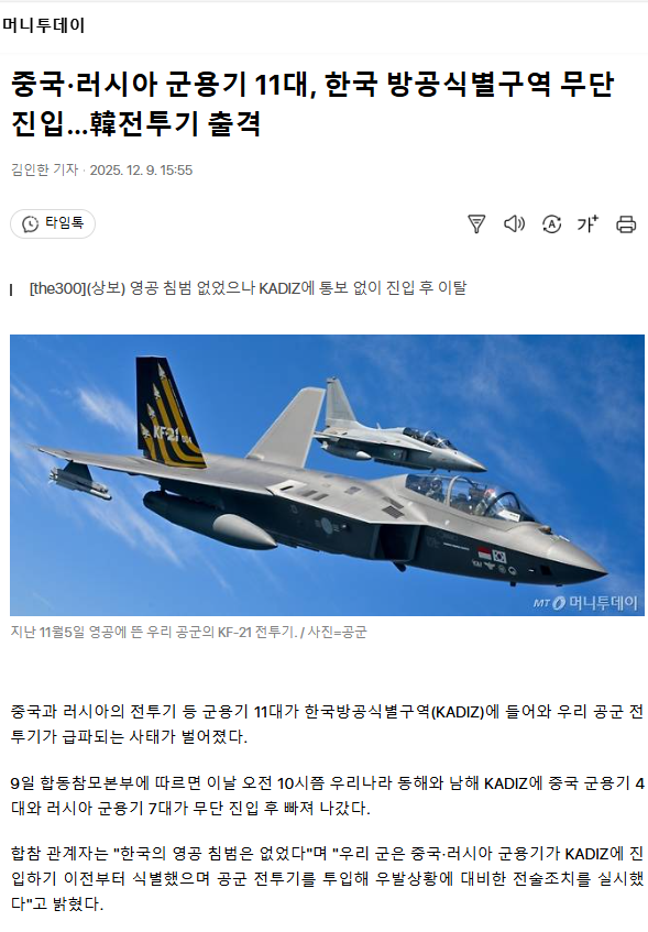 중국·러시아 군용기 11대, 한국 방공식별구역 무단 진입… 韓전투기 출격