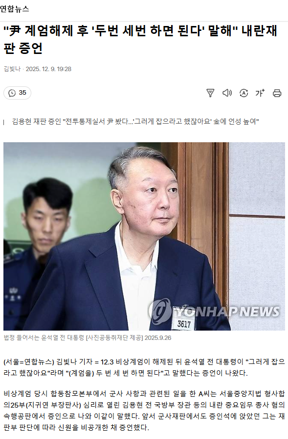 "尹 계엄해제 후 '두번 세번 하면 된다' 말해" 내란재판 증언