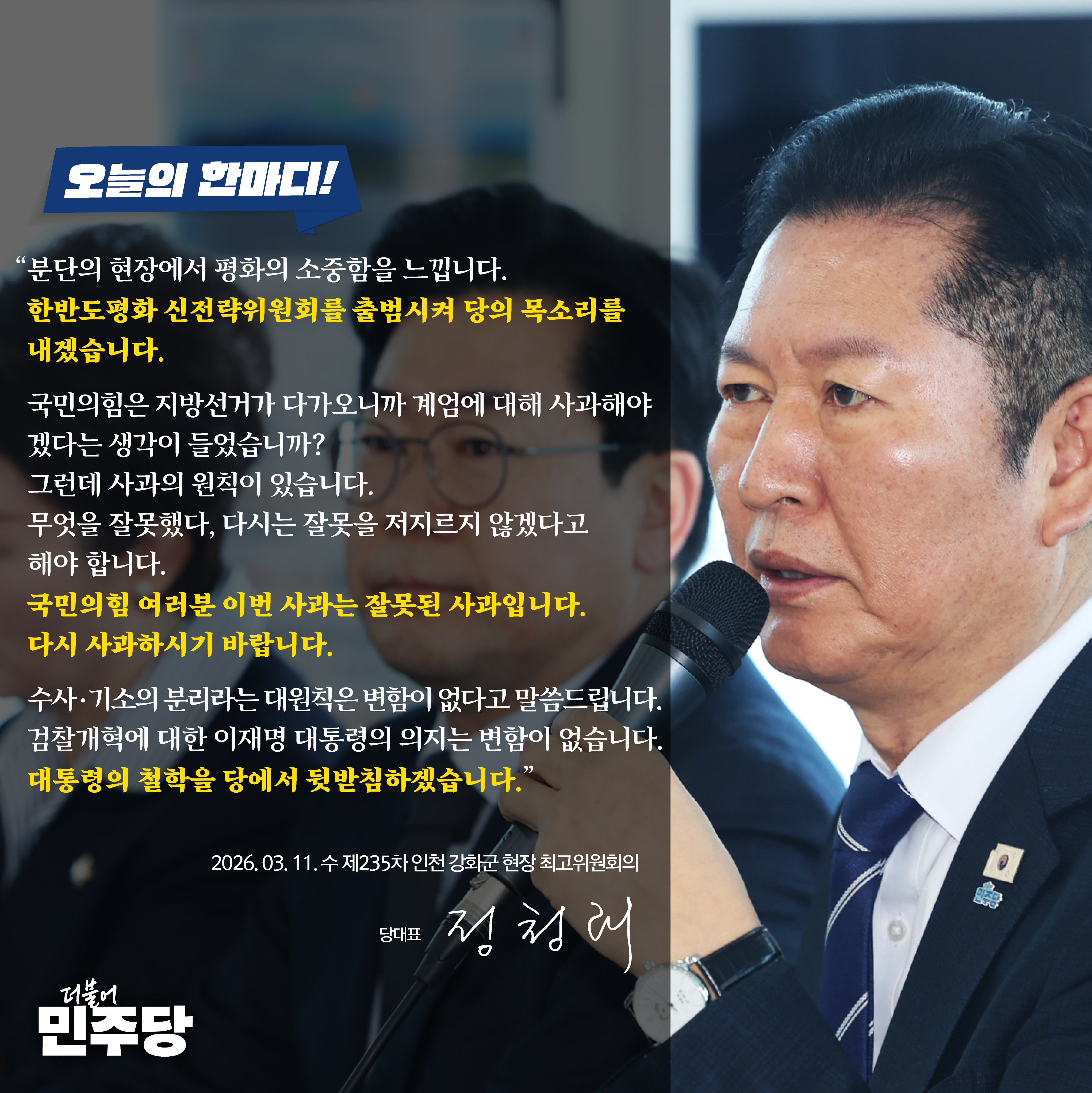 제235차 인천 강화군 민생 현장 최고위원회의 모두발언 □ 일시 : 2026년 3월 11일(수) 오전 10시□ 장소 : 강화평화전망대 2층 전망대 ■ 정청래 당대표 반갑습니다. 방금 전 망배단에서 묵념을 하고, 설명을 들었습니다. 항상 분단의 현장에 오면 평화가 얼마나 소중한 것인지 새삼 느끼게 됩니다. 대한민국은 평화가 경제고, 평화가 대한민국 발전의 가장 큰 꿈과 희망입니다. 우리는 수출로 먹고 사는 나라이고, 그러다 보니 대외 의존성이 높은 경제 구조를 갖고 있습니다. 평화가 흔들리면 경제도 흔들리고, 대한민국 민주주의도 흔들립니다. 평화의 소중함을 다시 한 번 깨닫게 합니다. 이재명 정부는 남북 관계의 복원과 그리고 글로벌 스탠다드 외교를 통해서 대한민국의 안정을 꾀하고 있습니다. 지금 이란 전쟁으로 국제질서가 매우 복잡하고 불안한 상황이지만, 그러함에도 불구하고 우리는 한 발 한 발 앞으로 나아가고 있습니다. 오늘 이 분단의 현장에 와서 다시 한 번 평화의 소중함을 느낍니다. 평화를 위한 길은 따로 없습니다. “평화가 곧 길입니다.” 한반도의 평화 정착을 위해서 당정청이 더욱더 노력하겠습니다. 민주당은 한반도 평화 신전략위원회를 출범시켜서 당이 할 수 있는 목소리를 앞으로 제대로 내겠습니다. 포지션에 따라서 정부가 청와대에서 다소 어려운 부분은 당이 좀 더 용감하게 다양한 목소리를 내자는 취지로 발표한 만큼, 당의 역할을 다하겠다는 말씀을 드립니다. 아까 우리 조택상 위원장님 말씀을 들어보니, 윤석열 정부의 조치로 많은 어민들께서 고통을 받고 있다고 봅니다. 이러한 어려움과 고통도 한 번 더 생각하고 또 체험을 하기 위해서 새우잡이 배를 하게 되는데요. 언론인들이 그렇게 관심이 많습니다. “새우잡이배를 같이 타고 싶다”고 하는데, 인원이 제한되어 있어서 풀단으로 몇 분만 타게 될 텐데요. 저도 오늘 새우 잡이 배를 하고 우리 어민들의 애환을 한번 느껴보도록 하겠습니다. 오늘 제 옆자리에는 저의 정치적 짝꿍인 박찬대 의원이 지금 나와 계시는데 반갑습니다. 열심히 하고 있습니까? 또 이렇게 박찬대 의원과 옆에 앉아 보니 이재명 당대표와 같이 최고위원 활동을 하면서 박찬대 당시 최고위원이 검찰독재대책위원회를 맡아서 이 착한 사람이 조금의 흔들림 없이, 물러섬 없이, 용기 있게 윤석열 검찰 독재 정권과 싸웠던 용감한 박찬대 당시 최고위원을 또 보게 됩니다. 박찬대 당시 최고위원과 저는 야당 탄압, 정적 제거, ‘이재명 죽이기’에 맞서서 우리 손 잡고 열심히 싸웠던 동지입니다. 이 현장에서 보니까 분단의 현실도, 엄혹함도 보게 되고 윤석열 정권 3년 동안 우리가 어떻게 견디고 싸워왔던가? 하는 것이 주마등처럼 스쳐 지나갑니다. 박찬대 의원이 지금 하고 있는 일도 잘 이루어져서 좋은 일만 있기를 바랍니다. 국민의힘에서요. 뭐 ‘절연’인지, ‘절윤’인지 뭔가를 하려고 하나 봅니다. 제가 입이 아프도록 ‘윤 어게인 가지고 되겠냐, 내란을 옹호해서야 되겠느냐’ 그러면서 당신들 잘해라. “당신들 위헌 정당 해산 심판 대상이 될 수도 있다. 정신 차려라.” 수차례 제가 얘기한 바 있습니다. 이제 와서 지방선거가 다가오니까 좀 걸쩍지근했습니까? 계엄에 대해서 사과하고 윤어게인과 끊겠다는 생각이 조금은 들었습니까? 진작 제 말을 듣지 그랬어요. 그런데 사과의 원칙이 있습니다. “무엇을 잘못했다. 앞으로는 이렇게 해서 다시는 잘못을 저지르지 않겠다.” 6하원칙에 의해서 깨끗하게 잡아야 됩니다. 그리고 윤석열 1심 무기징역 나왔을 때 장동혁 대표가 했던 그 기자회견 발언들이 다 있습니다. 그 발언은 매우 잘못했고 취소한다고 해야 믿을동 말동 중에서 말똥이 분명히 그래도 더 큽니다. 그런데 불과 얼마 전에 윤석열 1심 무기징역 나온 거 가지고 본인이 했던 말이 엄연히 살아 있는데 사과도 본인이 직접 입으로 하지 않고 송원석 원내대표를 통해서 발표문 형식으로 이렇게 하는 것을 보고 유감이 있겠습니까? 이런 경우는 꼭대기에다가 오히려 붙였다. 이렇게 얘기합니다. 국민의힘 여러분, 이번에 한 사과는 잘못된 사과입니다. 다시 사과하시기 바랍니다. 국민들은 그것을 기다리고 있습니다. 검찰 개혁과 관련해서 한 말씀 드리겠습니다. 제가 기자회견 때도 말씀드렸다시피 검찰 개혁은 이재명 정부와 민주당의 깃발이고 상징입니다. 제가 분명히 말씀드렸습니다. 그 깃발이 찢어지지 않도록 상징이 얼룩지지 않도록 하겠다고 말씀을 드린 바 있습니다. 우리는 검찰청을 폐지하는 정부 조직법을 이미 통과시켰습니다. 그러면서 우리는 수없이 다짐했습니다. ‘수사와 기소의 분리’라는 대원칙은 변함이 없다고 분명히 말씀을 드렸고, 다시 한 번 드립니다. 이재명 정부 출범 이후 검찰청 폐지, 사법개혁에 따른 법원개혁, 상법, 조작정보 근절을 위한 언론 개혁을 할 수 있었던 것은 국민들의 열망, 그리고 이재명 대통령의 결단과 의지 덕분이었습니다. 제가 여러 차례 말씀드렸습니다. 우리가 이런 말을 많이 합니다. “진료는 의사에게, 약은 약사에게, 수사는 경찰에게, 공소는 검사에게” 이 원칙은 한 치