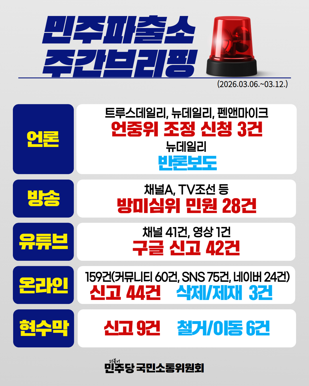 더불어민주당 국민소통위원회 민주파출소 주간브리핑 (3. 13, 금) 안녕하십니까. 더불어민주당 국민소통위원회 위원장 김현입니다. 3월 13일 금요일, 민주파출소 주간 주요 대응 현황 브리핑 시작하겠습니다. 민주파출소 제보 현황에 대해 보고드립니다. 3월 13일 00시 기준으로 한 주간 2,947명이 방문하였고, 383건의 제보가 접수되었습니다. 누적 건수로는 총 760,745명이 민주파출소를 방문하였고, 총 225,472건의 제보가 접수됐습니다. 매체별로 온라인이 154건 제보되어 가장 많고, 유튜브 86건, 네이버 18건 순으로 제보됐습니다. 민주파출소 주요 대응 현황 보고드립니다. 언론 대응 보고입니다. 트루스데일리의 3월 9일자 보도와 뉴데일리·펜앤마이크의 3월 11일자 보도와 관련하여, 사실관계를 바로잡고 더불어민주당의 입장을 반영하기 위해 언론중재위원회에 정정 및 반론보도로 조정 신청을 하였습니다. 한편 뉴데일리의 1월 27일자 보도에 대해서는 더불어민주당의 입장을 반영하는 반론보도로 언론사와 조정 합의가 이루어졌음을 보고드립니다. 방송 대응 보고입니다. 시사 프로그램, 뉴스, 라디오를 모니터링한 결과, 더불어민주당의 입장을 대변할 수 있는 출연자가 배제된 채 방송이 진행된 사례가 다수 확인되었습니다. 이에 따라 관련 규정 위반 소지가 있는 28건에 대해 방송미디어통신심의위원회에 심의를 요청했습니다. 유튜브 대응 보고입니다. 이재명 대통령 및 현 정부 정책과 관련하여 비난, 허위 사실을 유포하는 유튜브 영상이 다수 확인 되었습니다. 이에 따라 해당 영상을 포함한 총 41개의 채널과 1개의 영상을 신고 조치하였습니다. 현수막 대응 보고입니다. 총 9건의 불법 현수막을 확인하여 안전신문고에 신고하였으며, 같은 기간 동안 6건의 현수막이 이동 및 철거 조치되었습니다. 온라인 대응 보고입니다. 온라인 부문 신고는 커뮤니티 60건, SNS 75건, 네이버 24건으로 총 159건이었으며, 커뮤니티 3건, SNS 38건, 네이버 3건을 각 해당 플랫폼에 신고조치하였습니다. 이 중 3건은 삭제 혹은 제재되었습니다. 주요 제보는 ▲대통령 조롱·비방·딥페이크 등 가짜뉴스 ▲부정선거 선동 등 극우 가짜뉴스 등 이었습니다. 특히, 지방선거를 앞두고 극우세력의 ‘부정선거’ 선동 공세가 눈에 띄게 증가하고 있습니다. 법적 대응 보고입니다. ‘대통령 공소 취소 거래설’을 주장한 장인수 기자를 정보통신망법 위반 혐의로 고발 조치할 예정입니다. 이상으로 대응 보고드렸습니다. 3월 14일 토요일, 대한민국 민주주의 발전에 평생을 바치신 故 이해찬 국무총리의 49재가 봉행됩니다. 고인의 마지막 가는 길을 다시 한 번 정성 어린 마음으로 함께 추모해 주시길 부탁드립니다. 이렇듯 엄숙한 마음으로 고인을 기려야 할 시기에, 유감스러운 일이 발생했습니다. 지난 2019년 이후 활동이 중단되었던 고인의 공식 SNS 계정에서 해킹으로 의심되는 정황이 확인되었습니다. 3월 12일 목요일, 해당 계정에는 검찰개혁 관련 게시글과 타 유튜브의 영상이 업로드되었으며, 현재 1.6만 회 이상의 조회수를 기록하며 무분별하게 확산되고 있습니다. 타인의 SNS 계정을 해킹하는 행위는 명백한 범죄행위이자, 이는 고인의 명예를 실추시키는 심각한 모욕에 해당합니다. 국민소통국은 해당 사안에 대해 면밀히 사실관계를 확인하고 있으며, 파악된 결과에 따라 필요한 조치를 취할 예정입니다. 국민 여러분께서도 관련한 허위 게시글이나 다른 해킹 정황을 발견하실 경우, 민주파출소로 적극 제보해 주시기 바랍니다. 감사합니다. 2026년 3월 13일더불어민주당 국민소통위원회