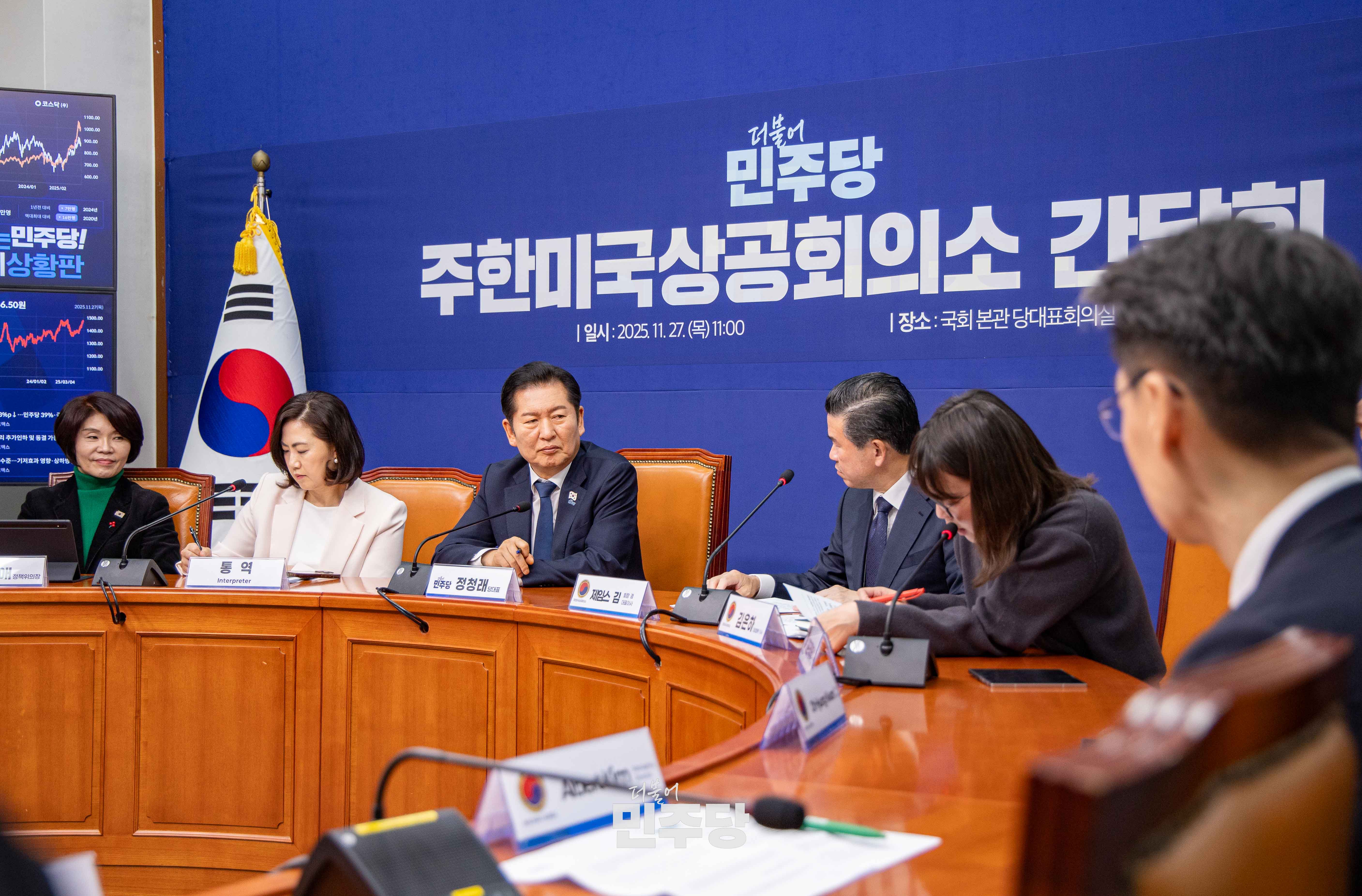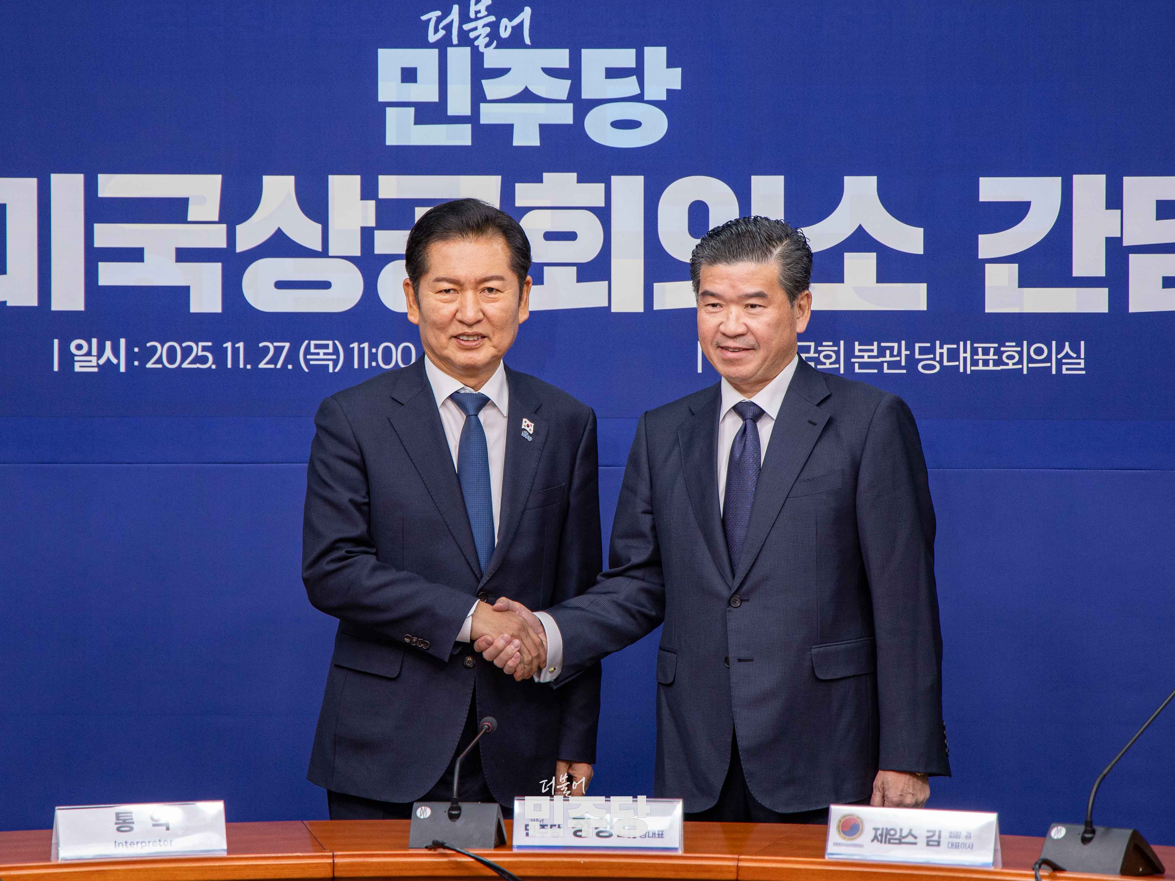 정청래 당대표가 2025.11.27.(목) 국회 본청 당대표회의실에서 열린 주한미국상공회의소 간담회에 참석하여 기념촬영을 하고 있다.