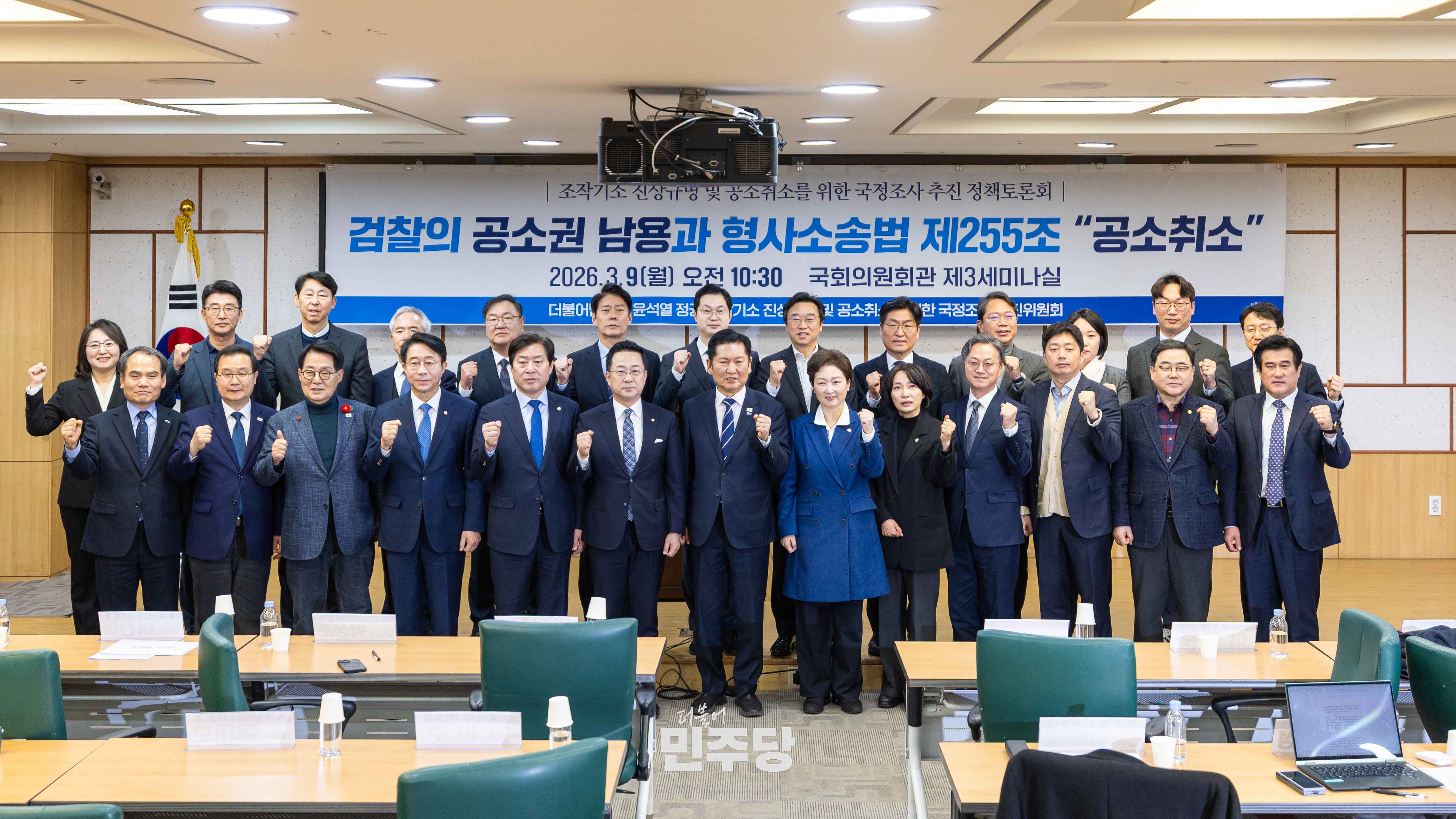 정청래 당대표가 2026.03.09.(월) 국회 의원회관 제3세미나실에서 진행된 조작기소 진상규명 및 공소취소를 위한 국정조사 추진 정책토론회에 참석하여 기념촬영을 하고 있다.