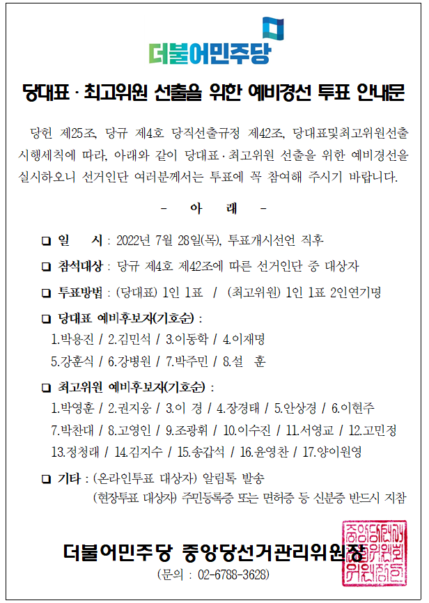 당대표·최고위원 선출을 위한 예비경선 투표 안내문