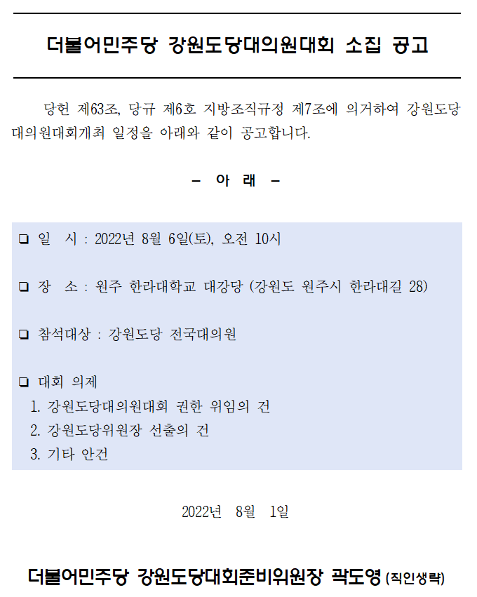 더불어민주당 인천광역시당 시‧도당대의원대회 소집 공고
