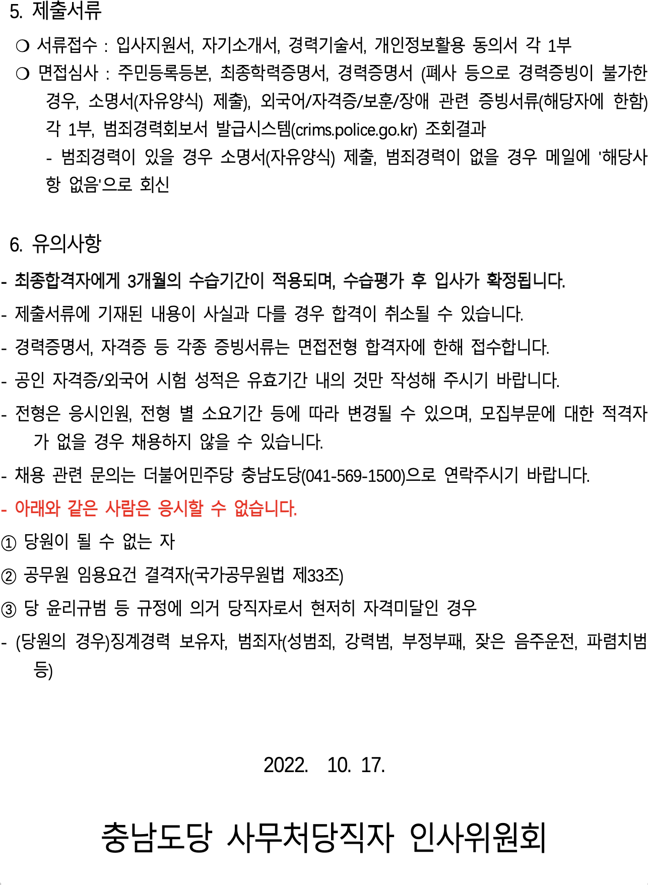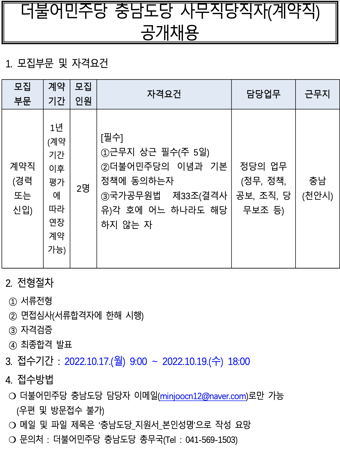 더불어민주당 충남도당 사무직당직자(계약직) 채용공고(2차)