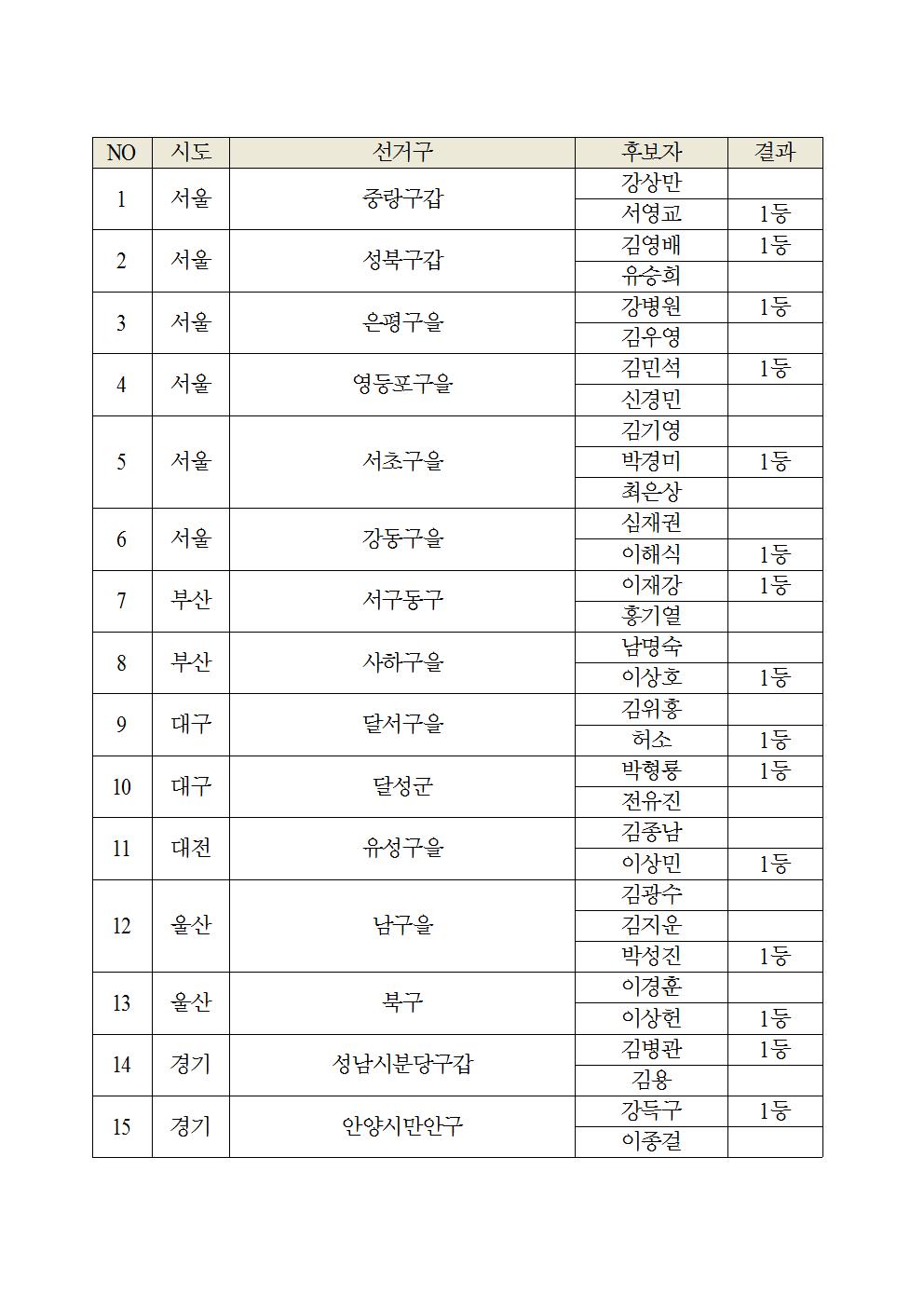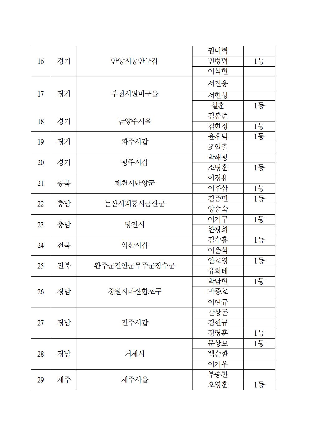 제21대 국회의원선거 지역구 경선 제1차(29곳) 결과 발표