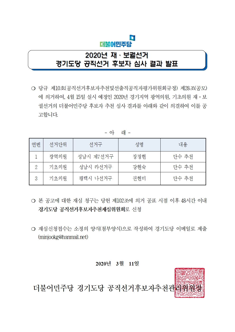 2020년 재·보궐선거 경기도당 공직선거 후보자 심사 결과 발표