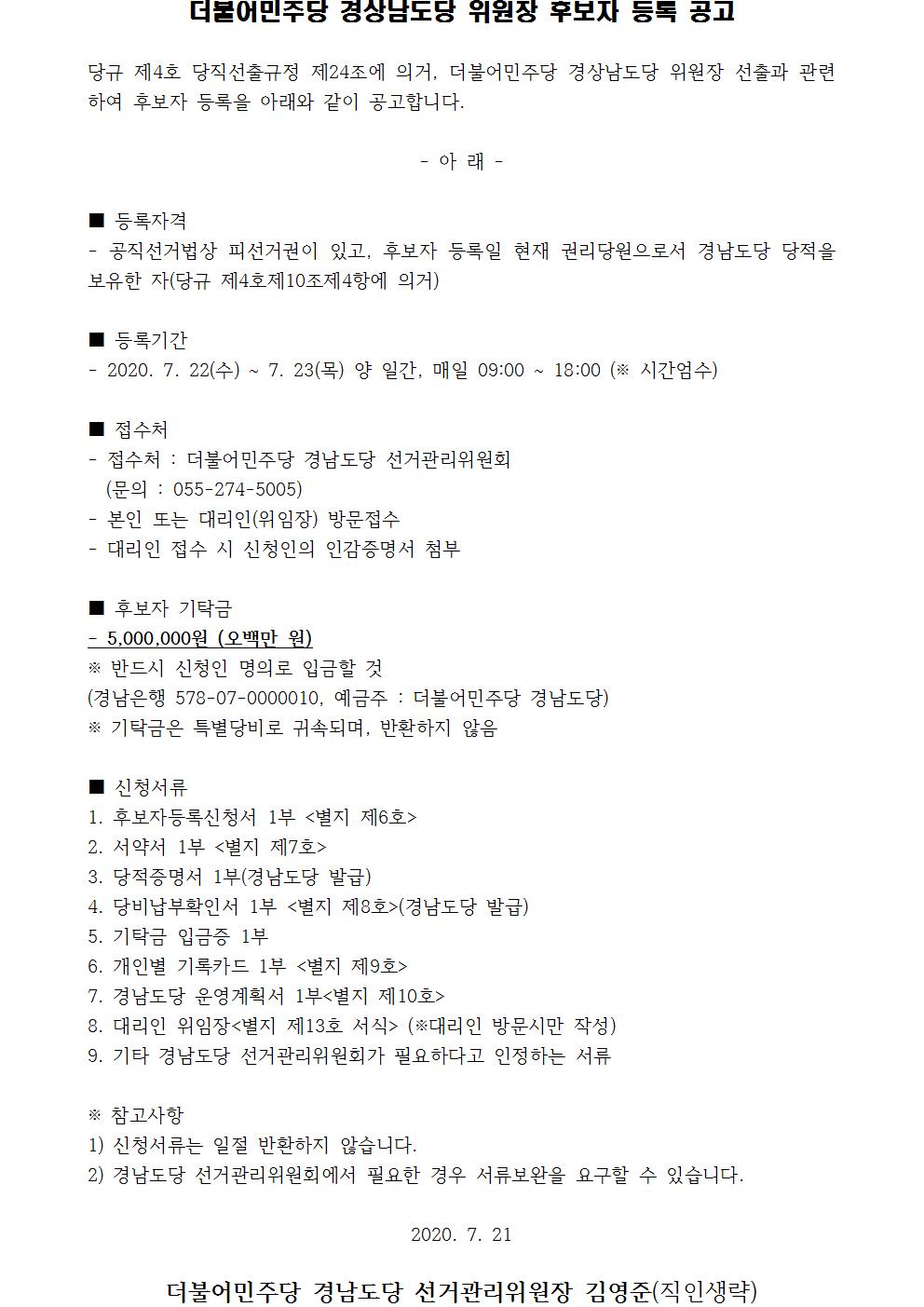 더불어민주당 경상남도당 위원장 후보자 등록 공고