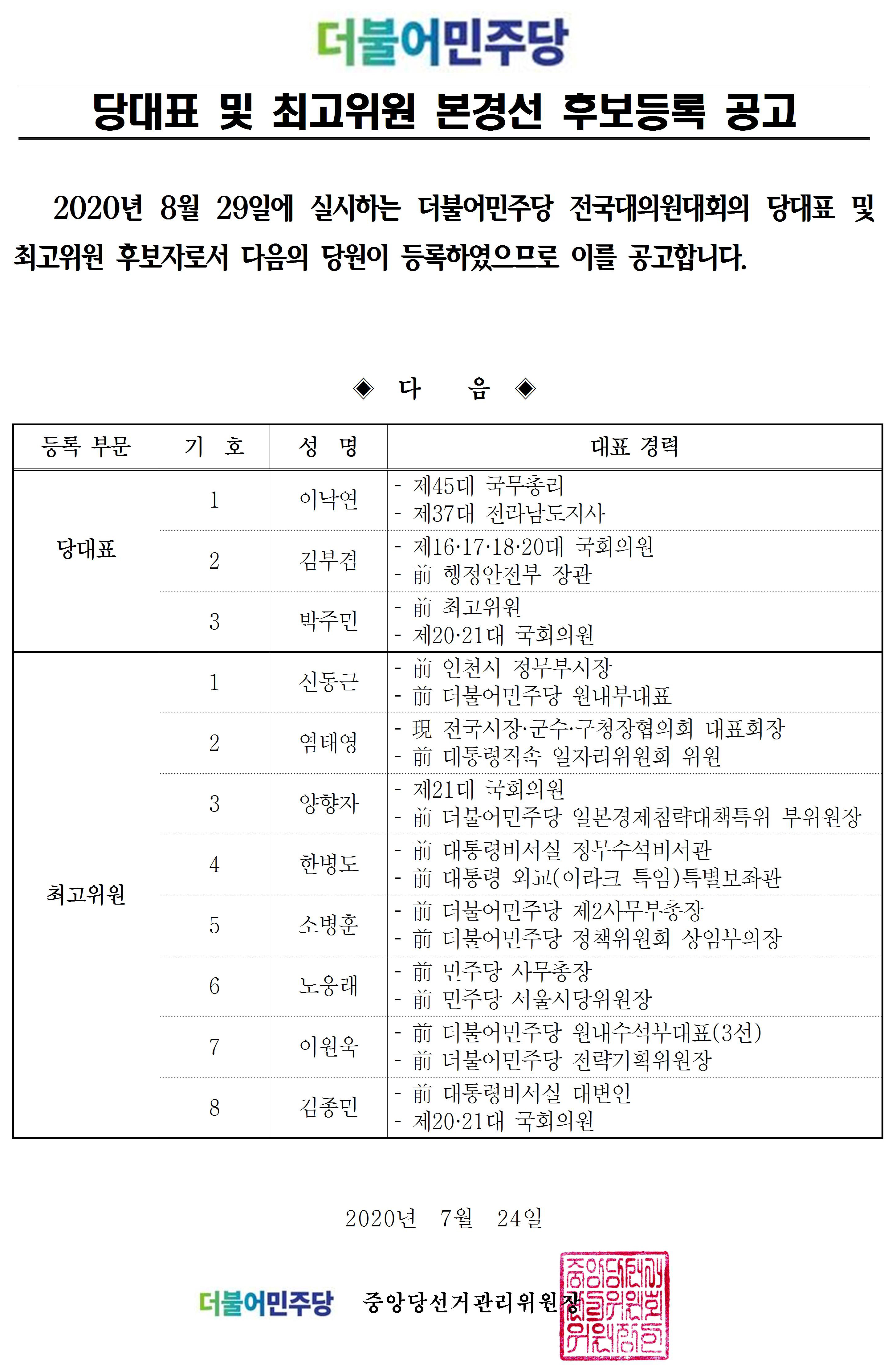 당대표 및 최고위원 본경선 후보등록 공고
