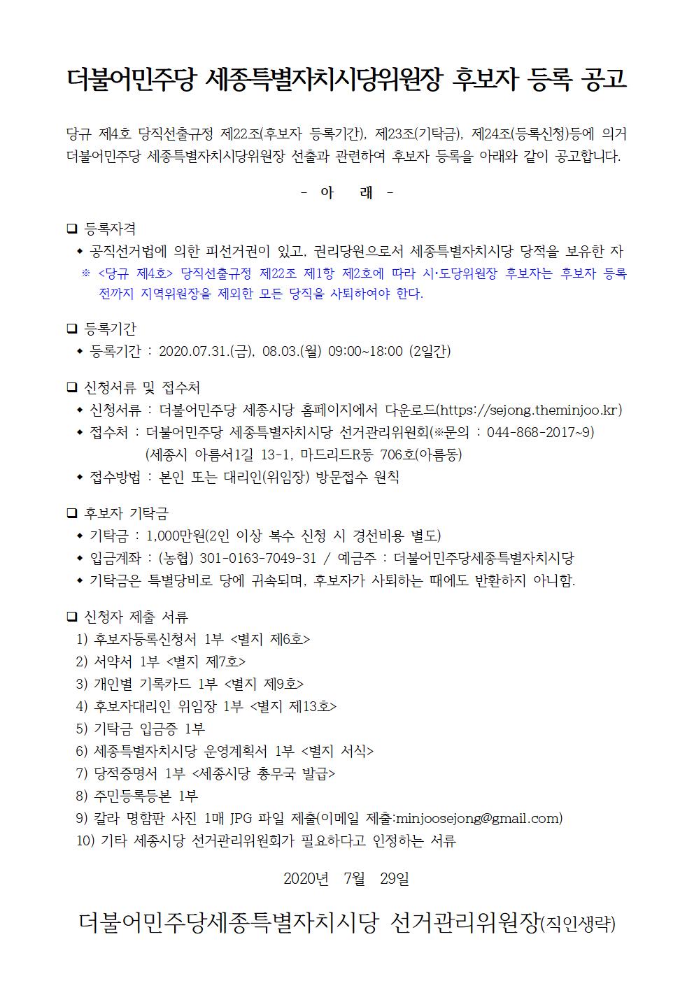 더불어민주당 세종특별자치시당위원장 후보등록 안내 공고