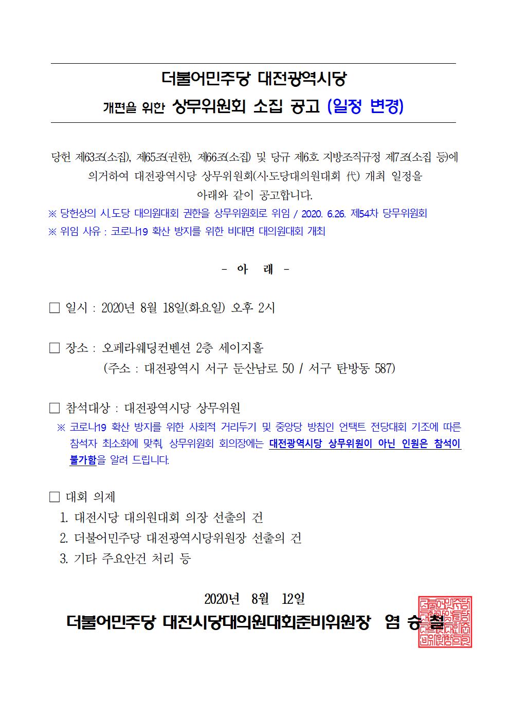 더불어민주당 대전광역시당 상무위원회 소집 공고