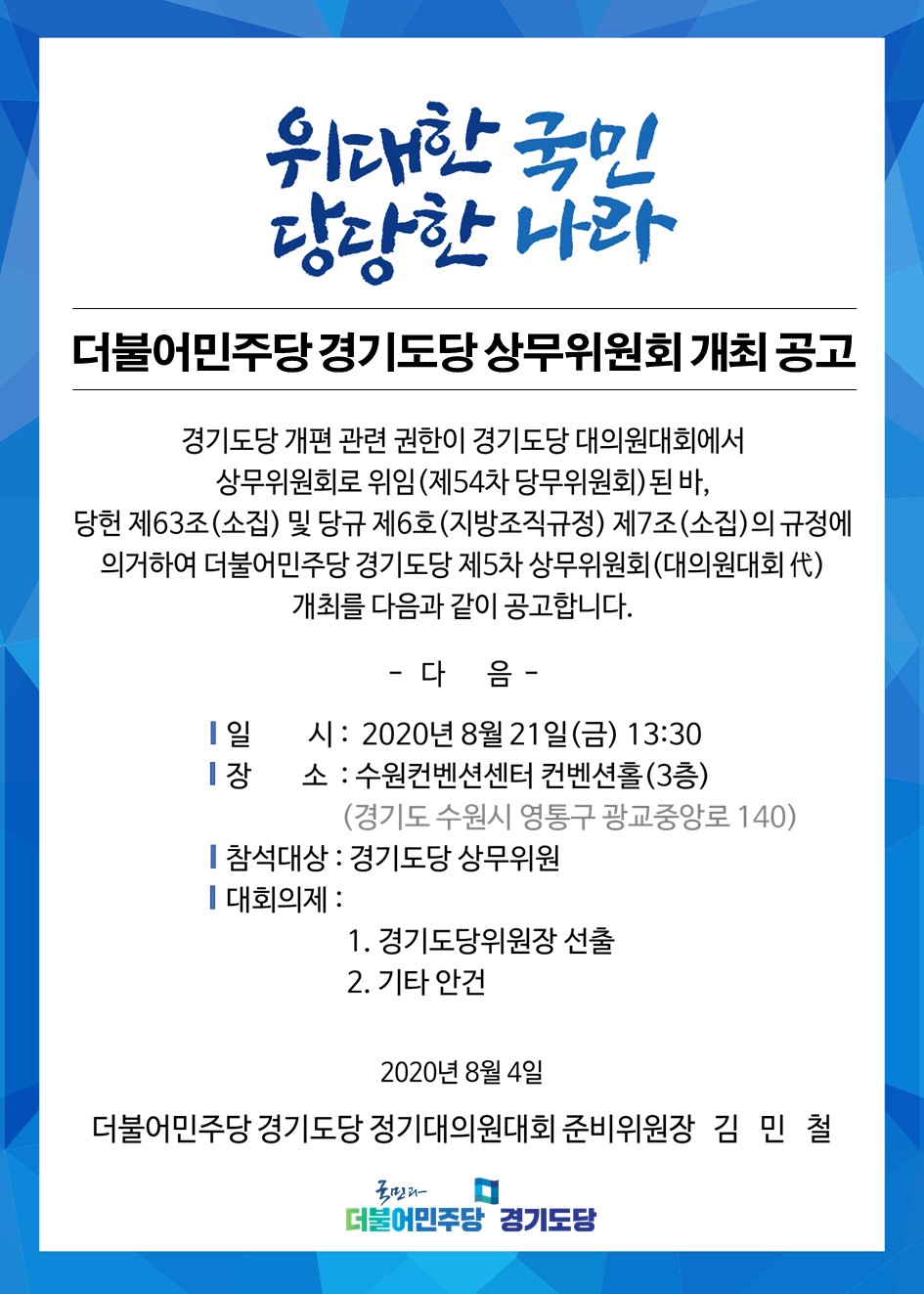 더불어민주당 경기도당 상무위원회 개최 공고