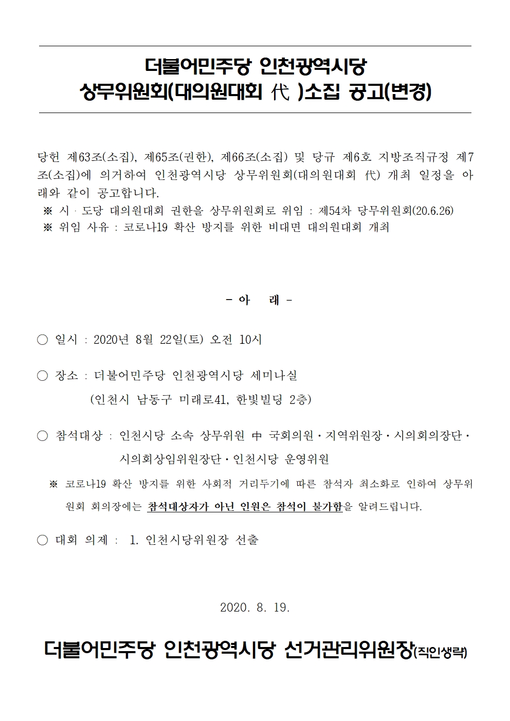 더불어민주당 인천광역시당 개편을 위한 상무위원회 소집 공고