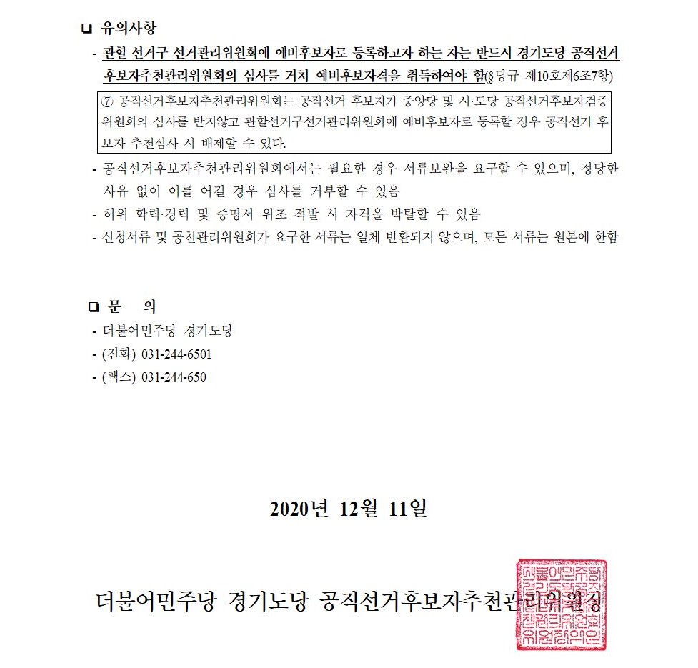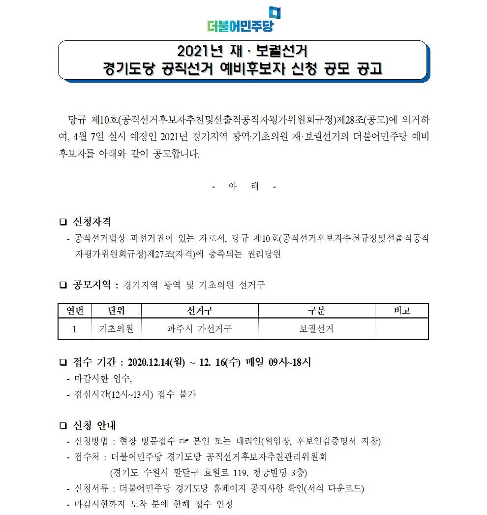 2021년 재·보궐선거 경기도당 공직선거 예비후보자 신청 공모 공고 (광역)