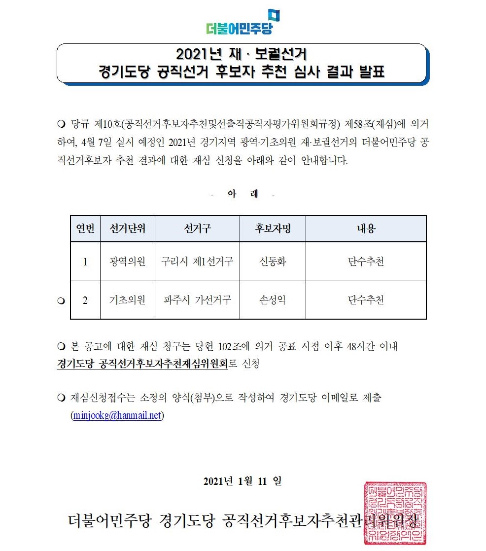 2021년 재·보궐선거 경기도당 공직선거 후보자 추천 심사 결과 발표