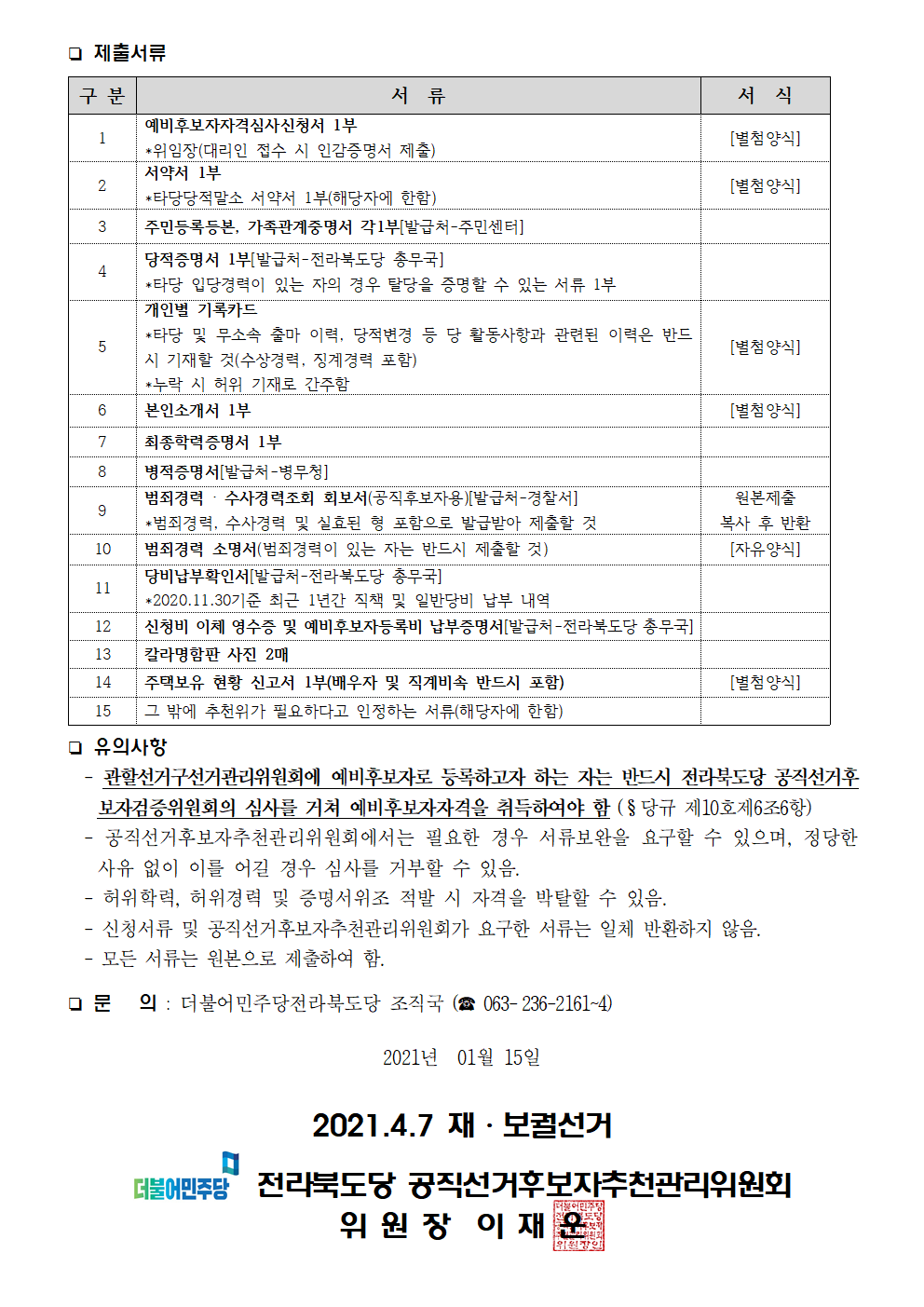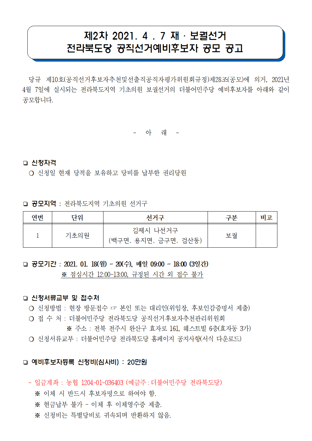 제2차 2021.4.7 재‧보궐선거 전라북도당 공직선거예비후보자 공모 공고