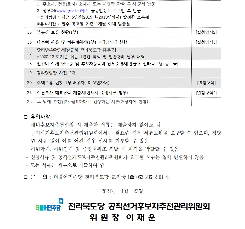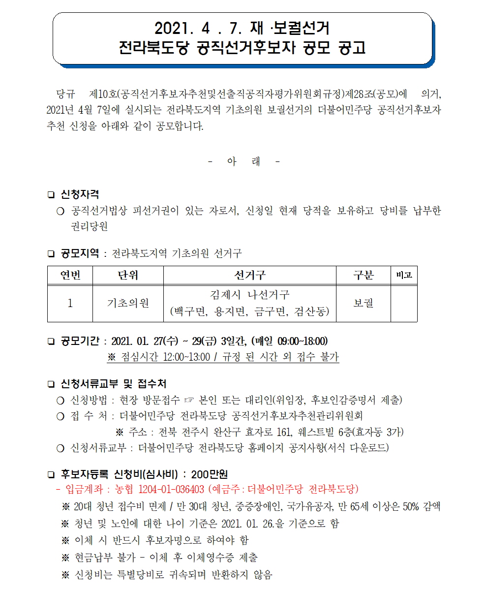 2021.4.7 재·보궐선거 전라북도당 공직선거후보자 공모 공고