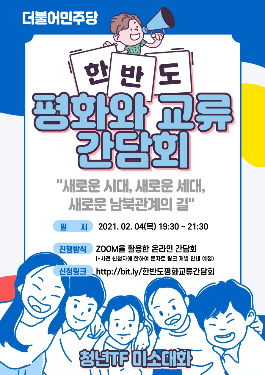 이번주 더불어민주당 청년TF 미소대화에서는 "새로운 시대, 새로운 세대, 새로운 남북관계의 길"이라는 주제로 평화와 교류를 고민하는 청년 및 단체와 함께 소통하는 자리를 마련하여, 현재 통일 교육, 통일 방안 등에 대해 미래세대 생각과 의견을 청취하는 시간을 갖고자 합니다.