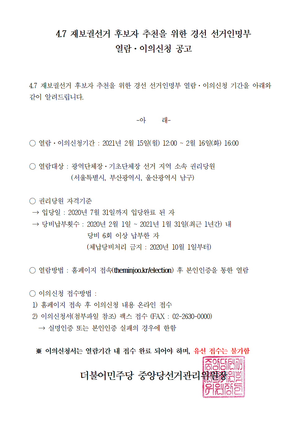 선거인명부 열람 및 이의신청 페이지 : https://theminjoo.kr/election