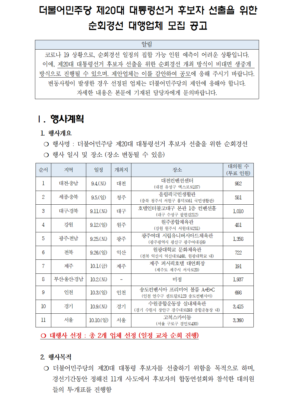 더불어민주당 제20대 대통령선거 후보자 선출을 위한 순회경선 대행업체 모집 공고