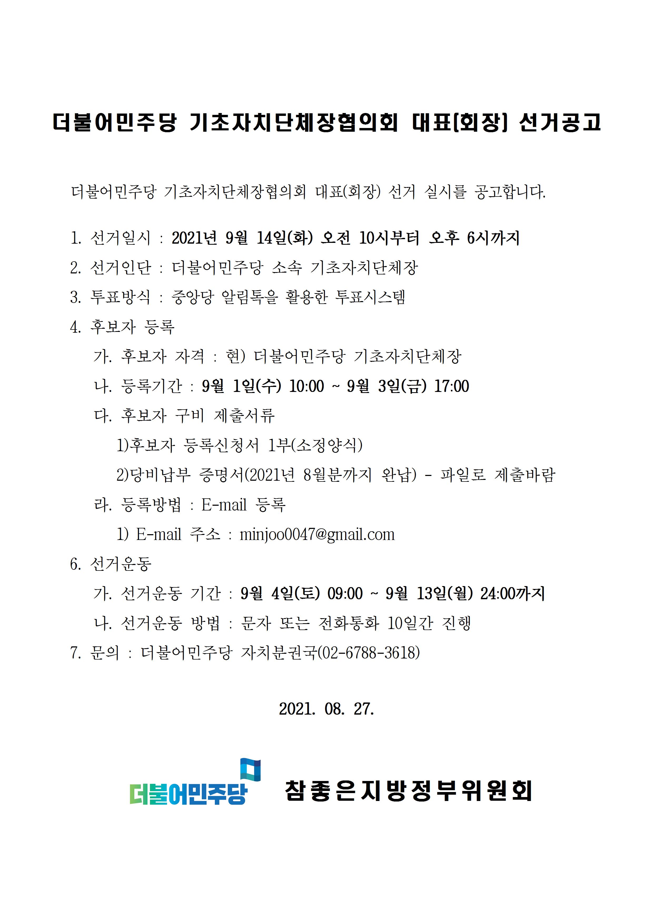 더불어민주당 기초자치단체장협의회 대표(회장) 선거공고