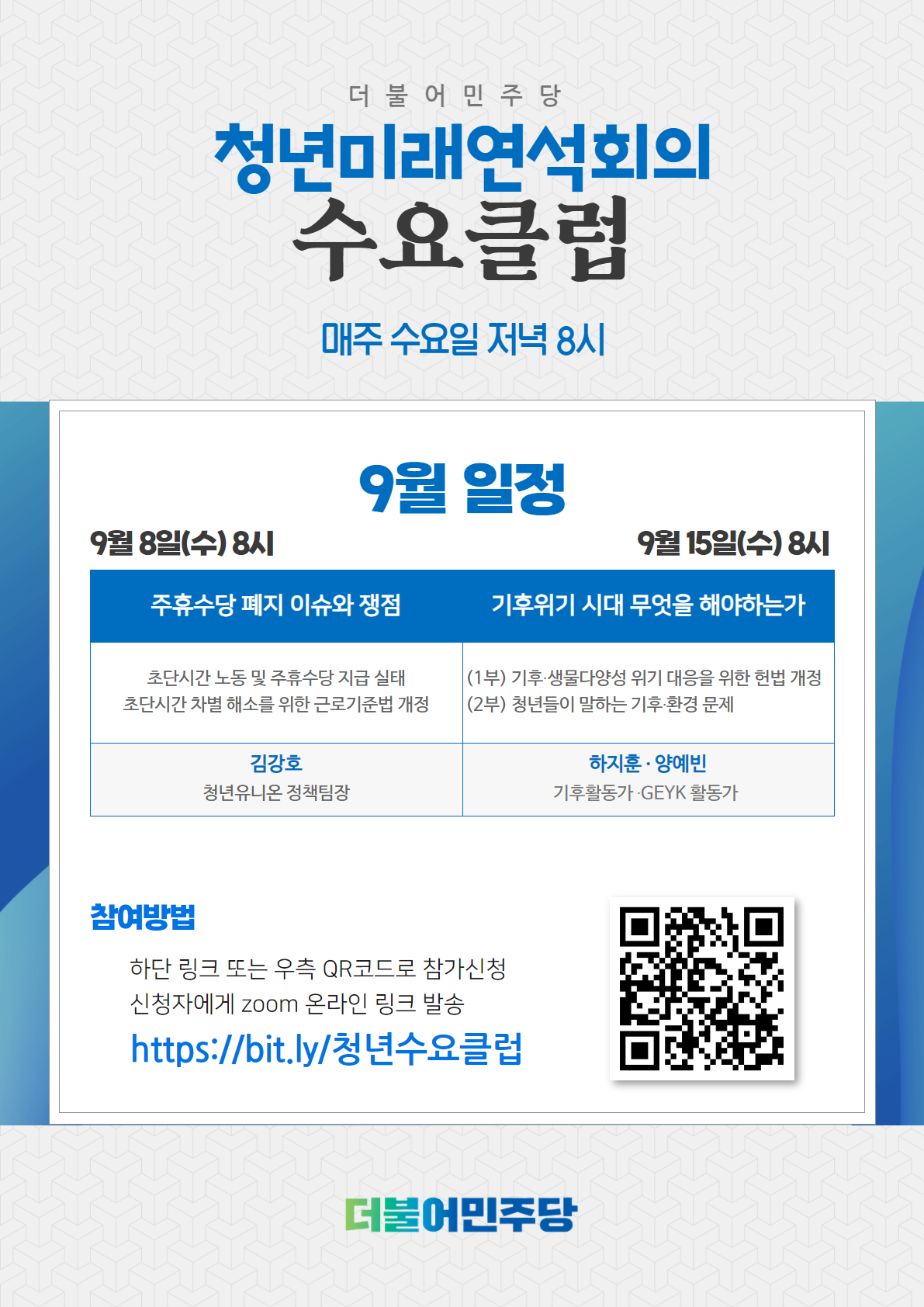 청년 당사자의 생생한 목소리를 듣고, 청년의 삶과 관련된 주요한 현안을 챙길 수 있도록 매주 수요일 저녁 8시, 더불어민주당 청년미래연석회의에서 '수요클럽'을 운영합니다.