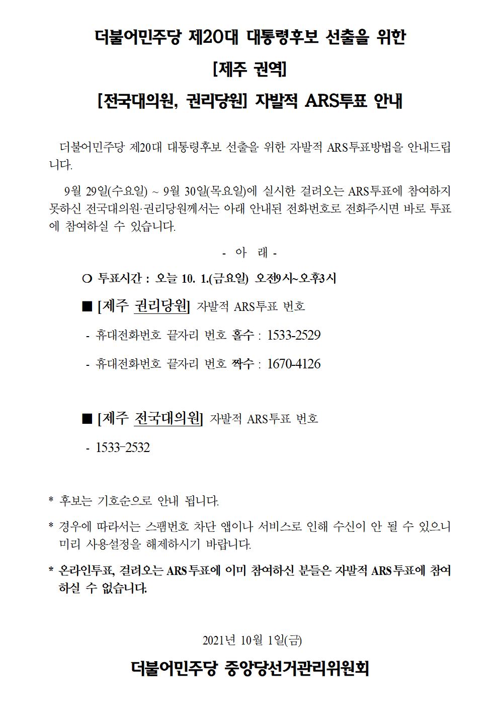 더불어민주당 제20대 대통령후보 선출을 위한 [제주 권역] 자발적 ARS투표 안내