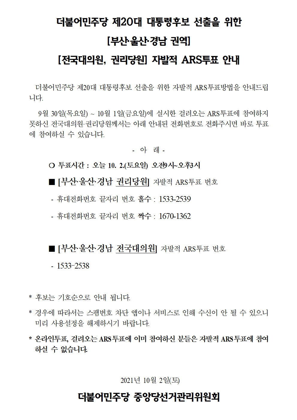 더불어민주당 제20대 대통령후보 선출을 위한 [부산·울산·경남 권역] 자발적 ARS투표 안내