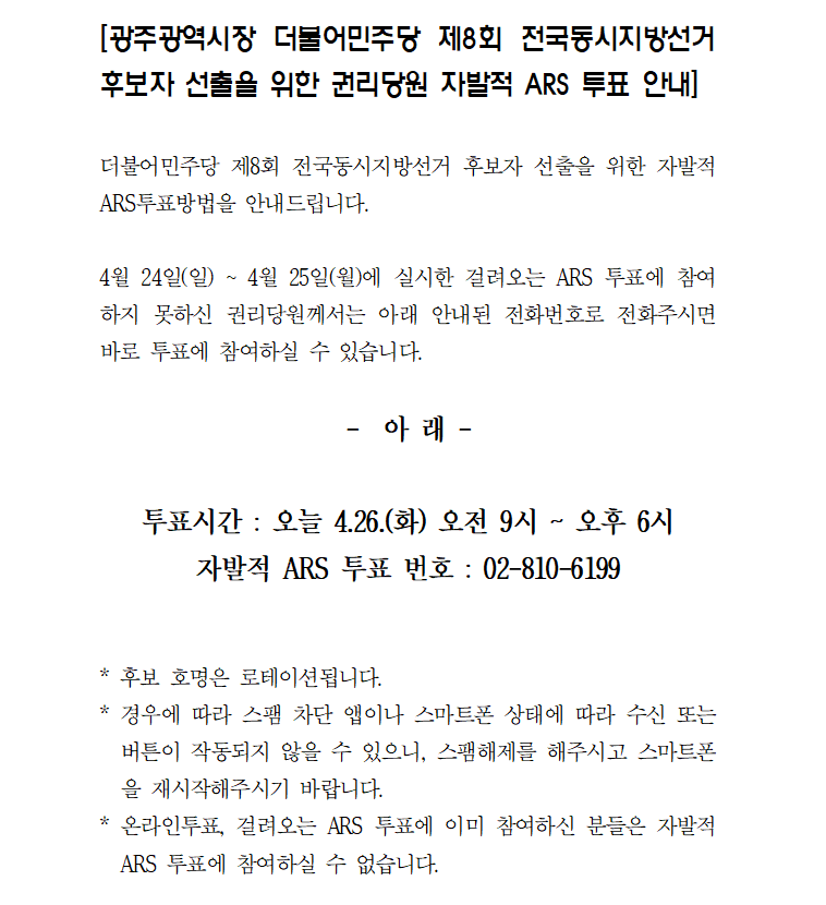 광주광역시장 더불어민주당 제8회 전국동시지방선거 후보자 선출을 위한 권리당원 자발적 ARS 투표 안내