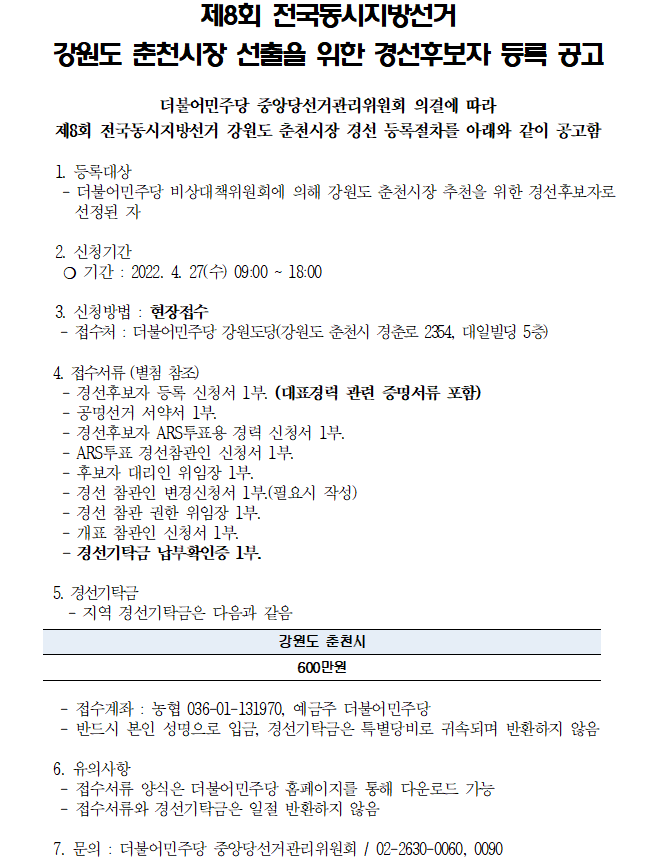 제8회 전국동시지방선거 강원도 춘천시장 선출을 위한 경선후보자 등록 공고