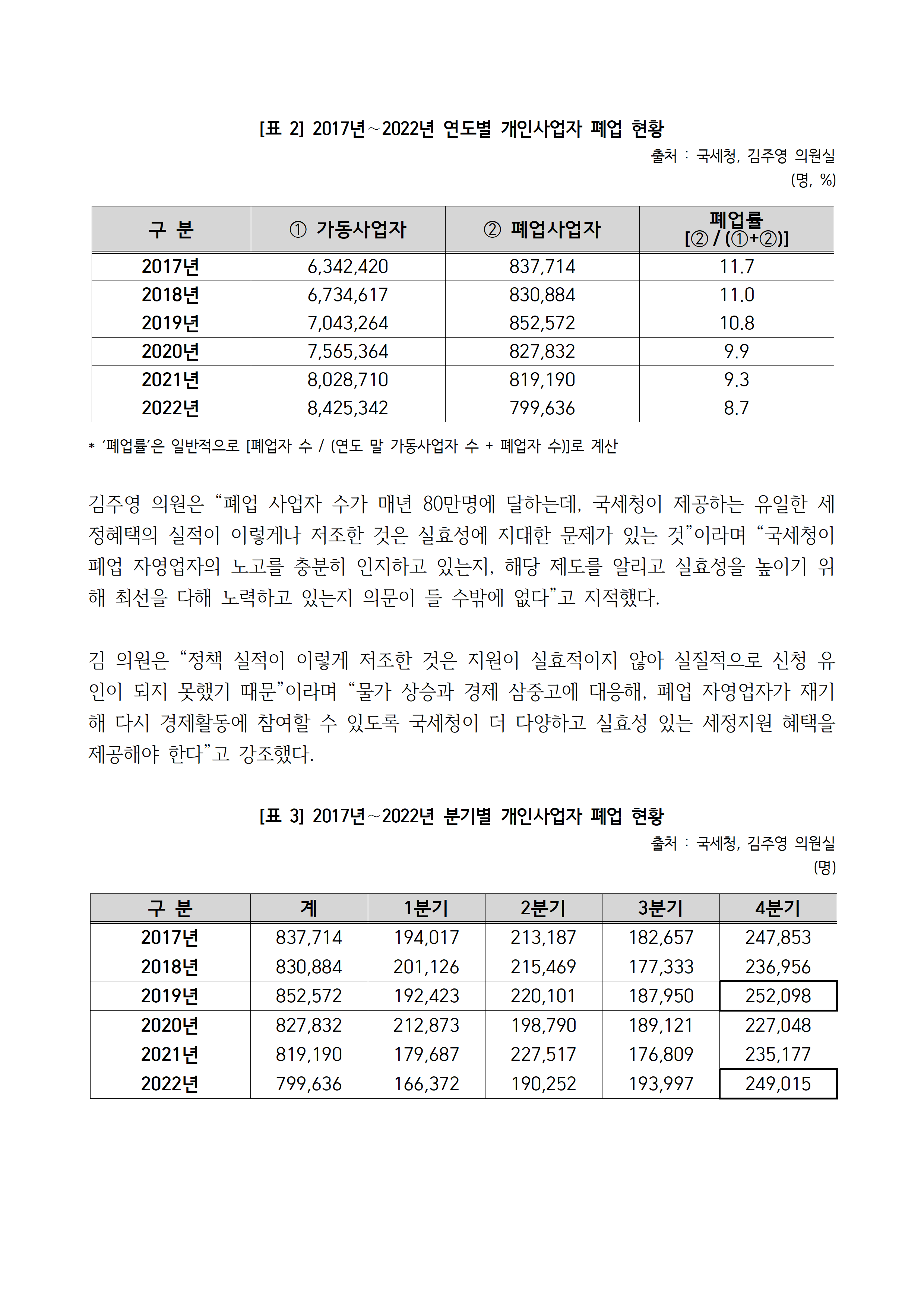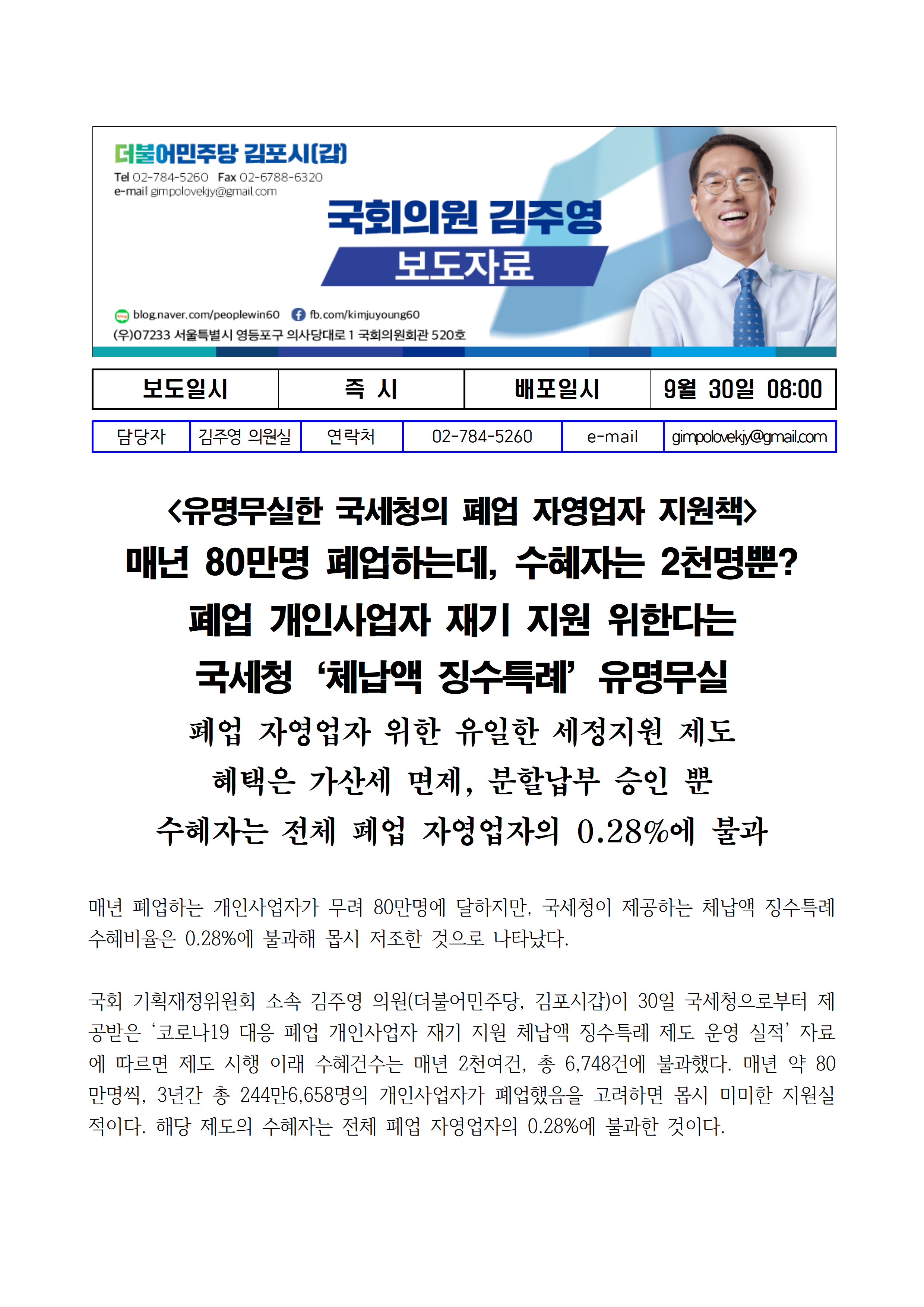 [김주영 의원 국감보도자료] <유명무실한 국세청의 폐업 자영업자 지원책> 매년 80만명 폐업하는데, 수혜자는 2천명뿐? 국세청‘체납액 징수특례’유명무실