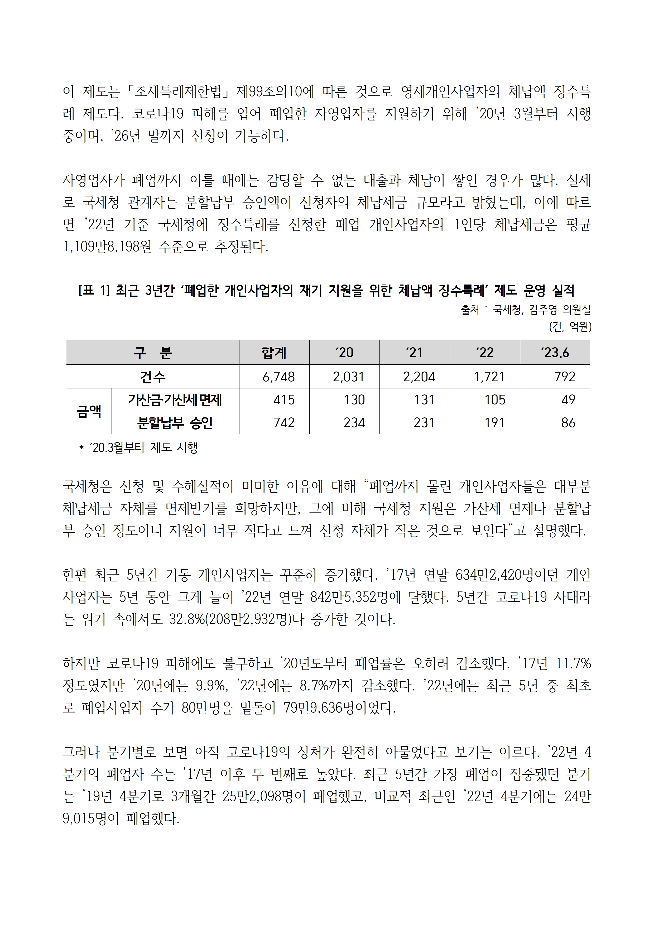 230930_국감보도자료_김주영_의원_국세청_폐업_개인사업자_재기_지원_체납액_징수특례_제도_유명무실.hwp