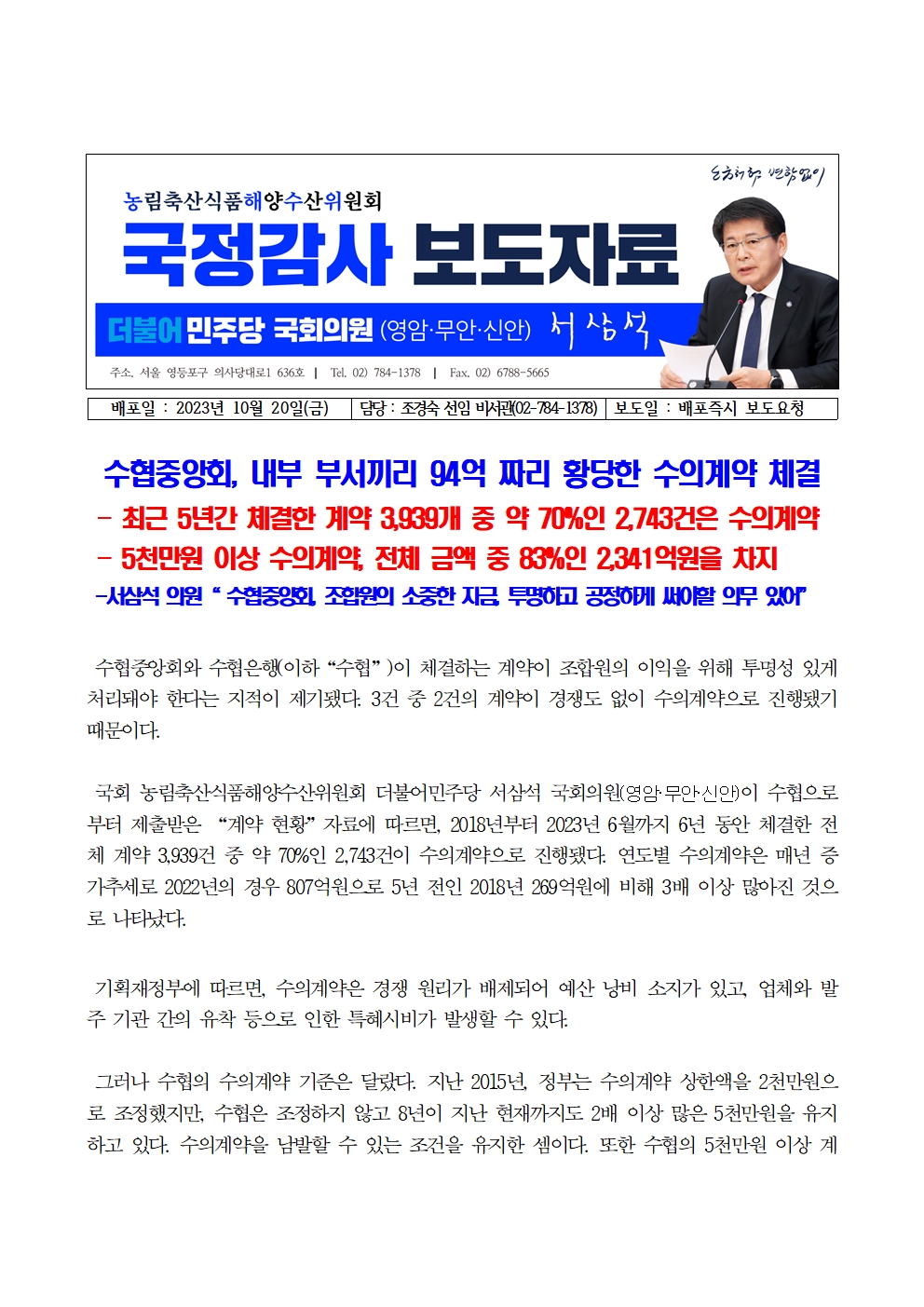 [서삼석 국회의원]231020_서삼석,"수협중앙회, 내부 부서끼리 94억 짜리 황당한 수의계약 체결"
