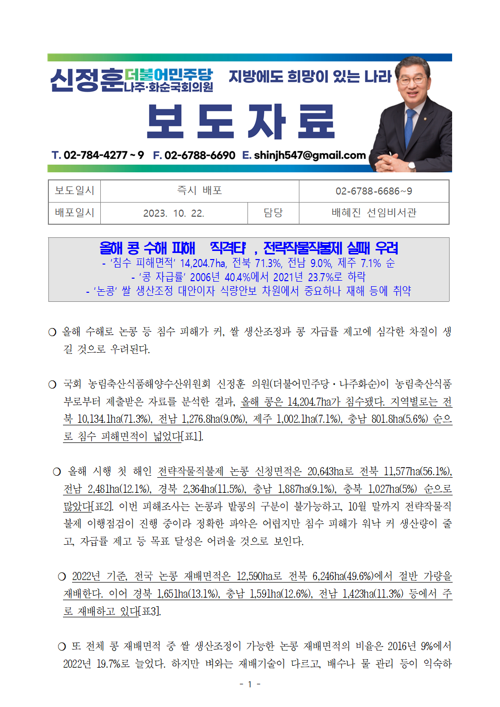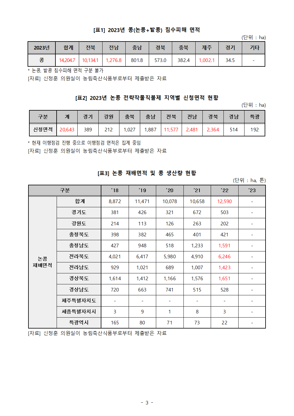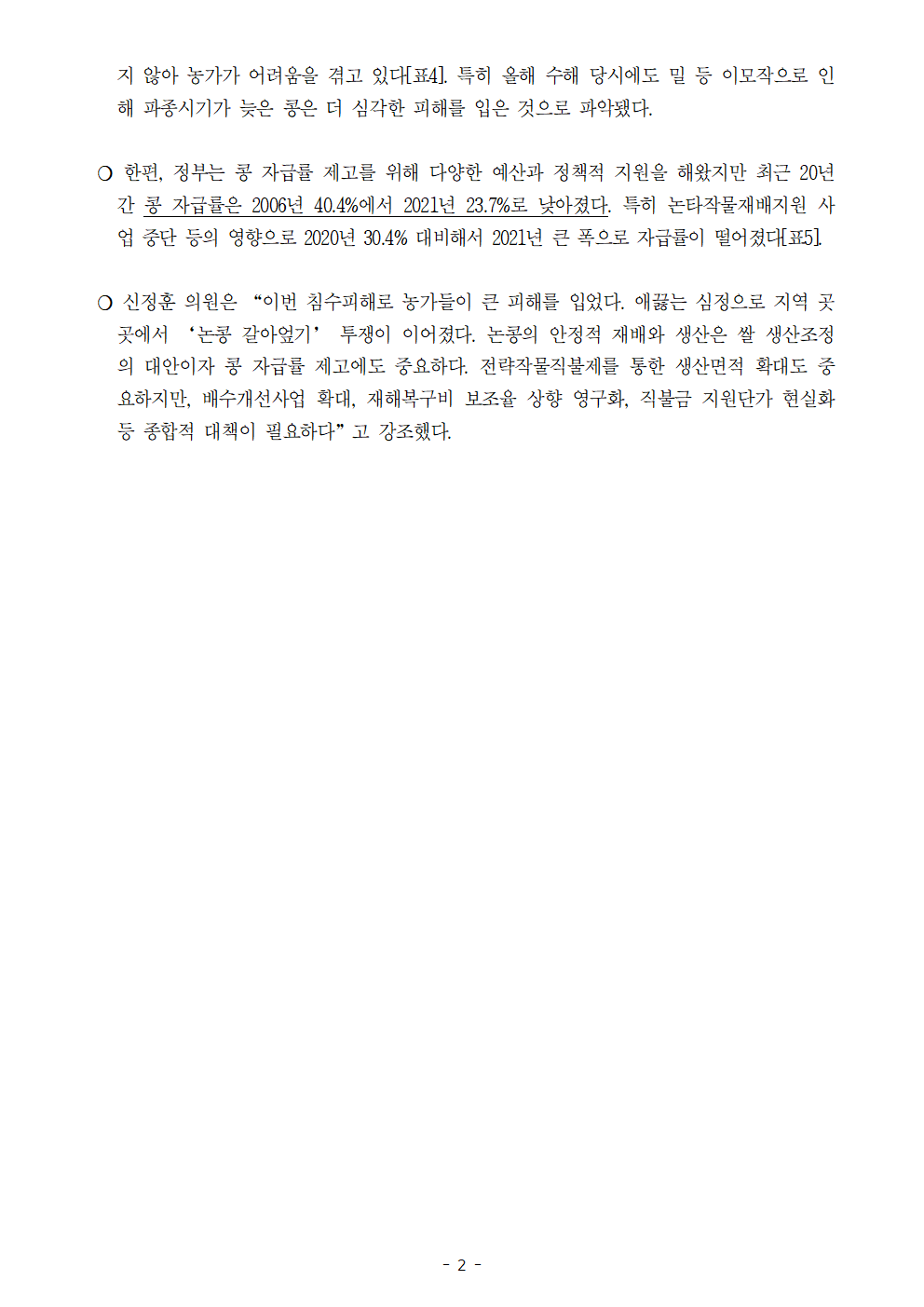 [신정훈 의원 보도자료] 올해 콩 수해 피해 ‘직격타’, 전략작물직불제 실패 우려